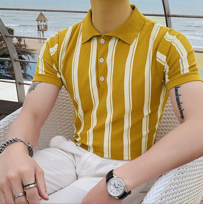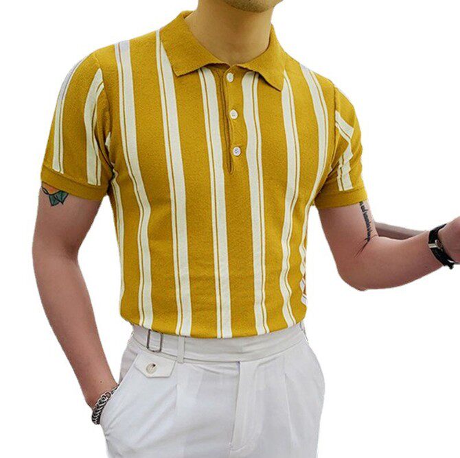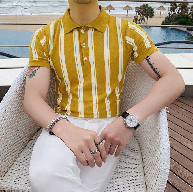 Летний желтый трикотажный тонкий свитер, футболка polo, облегающий крой