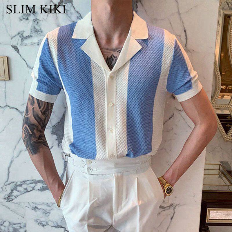 Feature:Винтажный дизайн, классическая тонкая посадка, вязаная рубашка на пуговицах, повседневные топы с коротким рукавом, контрастный рисунок, без пиломов.