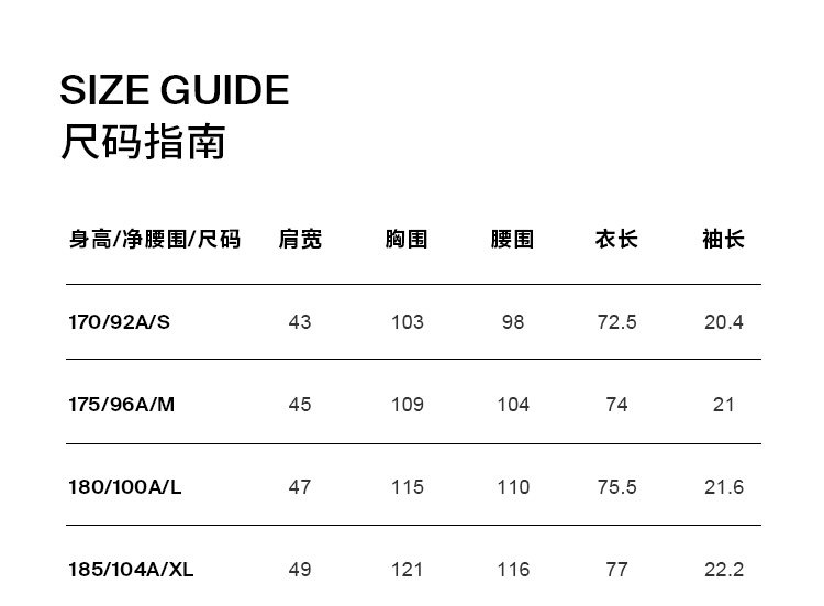 - = 195/112A/XXXL 190/108A/XXL 185/104A/XL 180/100A/L
