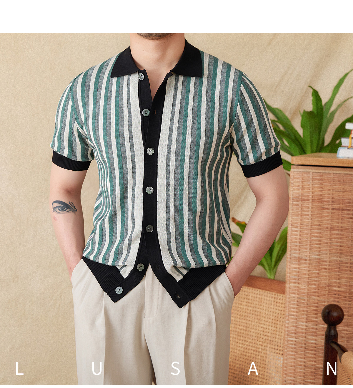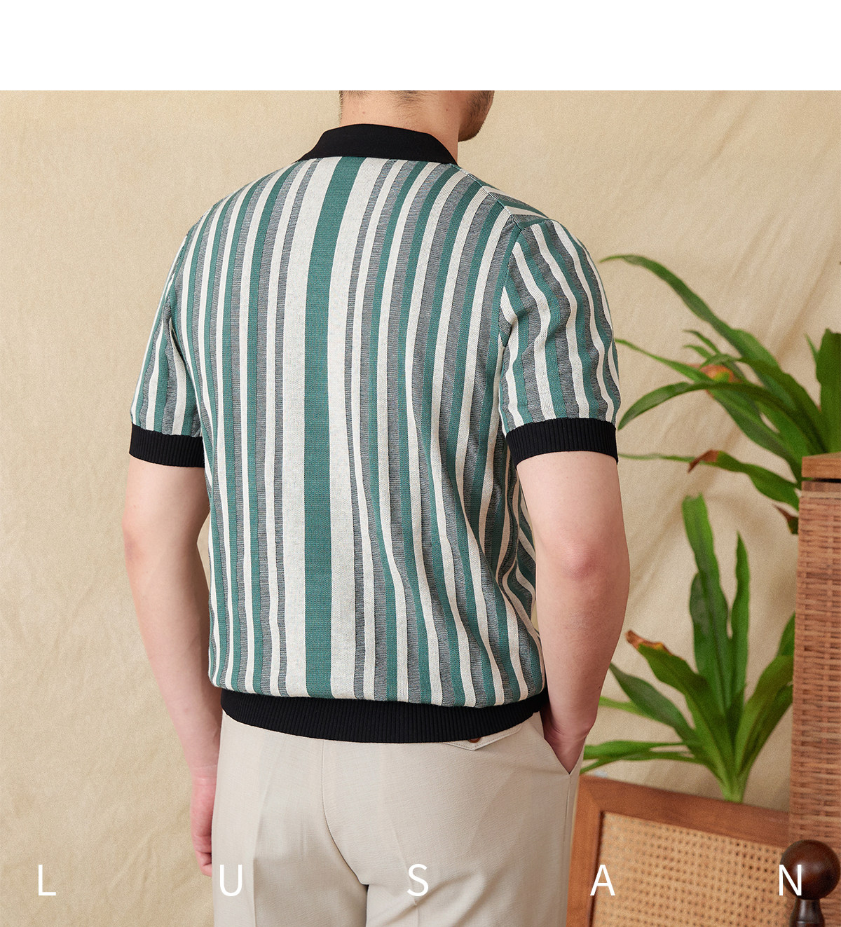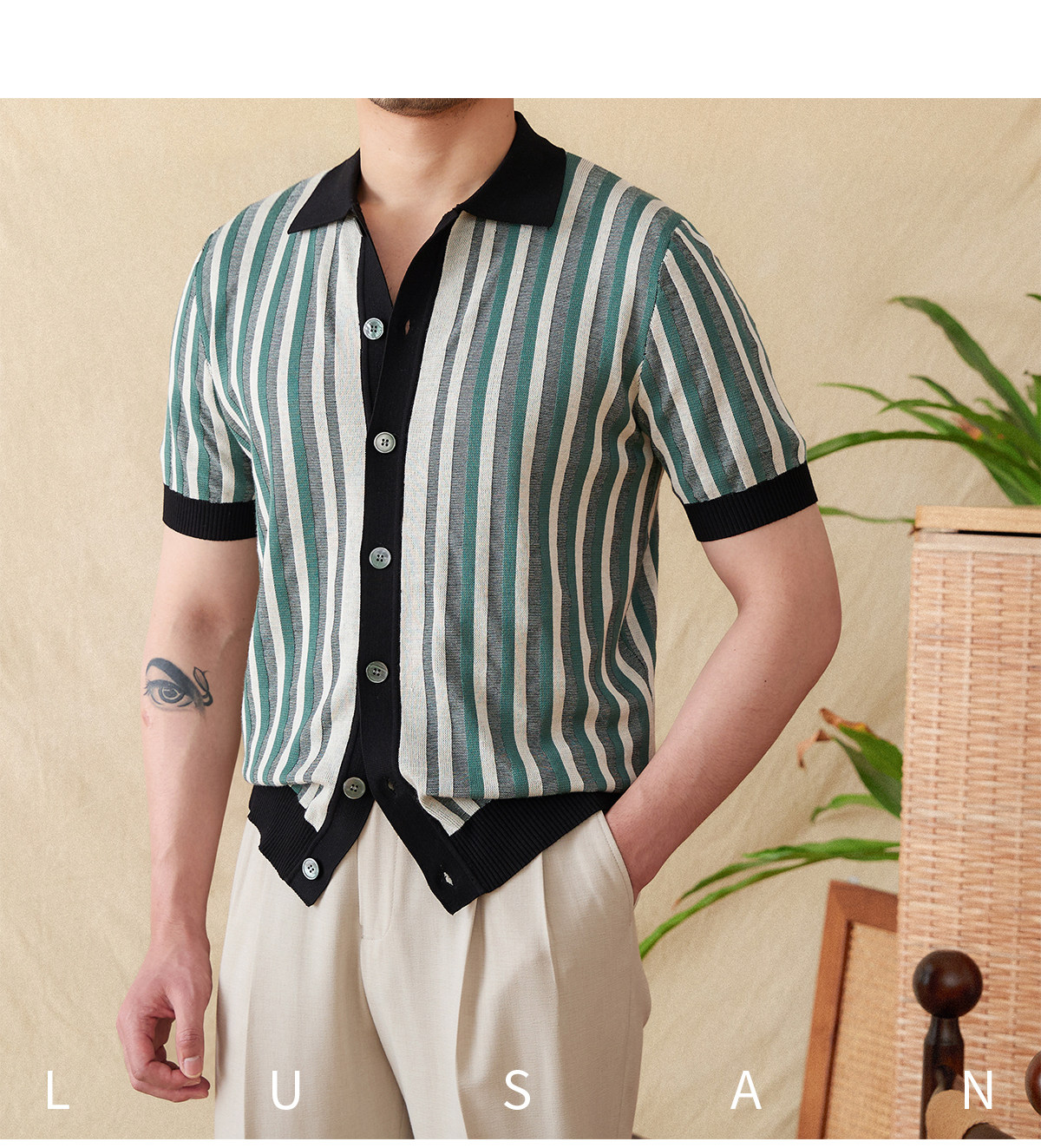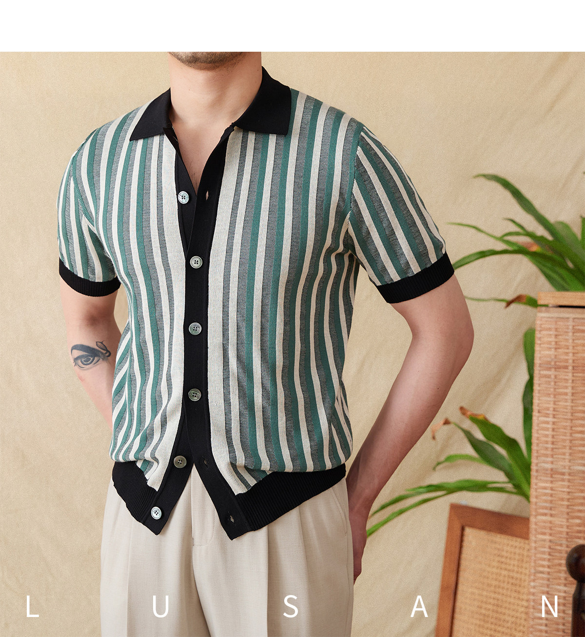 Мистер Лу Сан итальянский летний лацкат полосатый жаккардовый свитер сплайсинга в британском рубашке с коротки