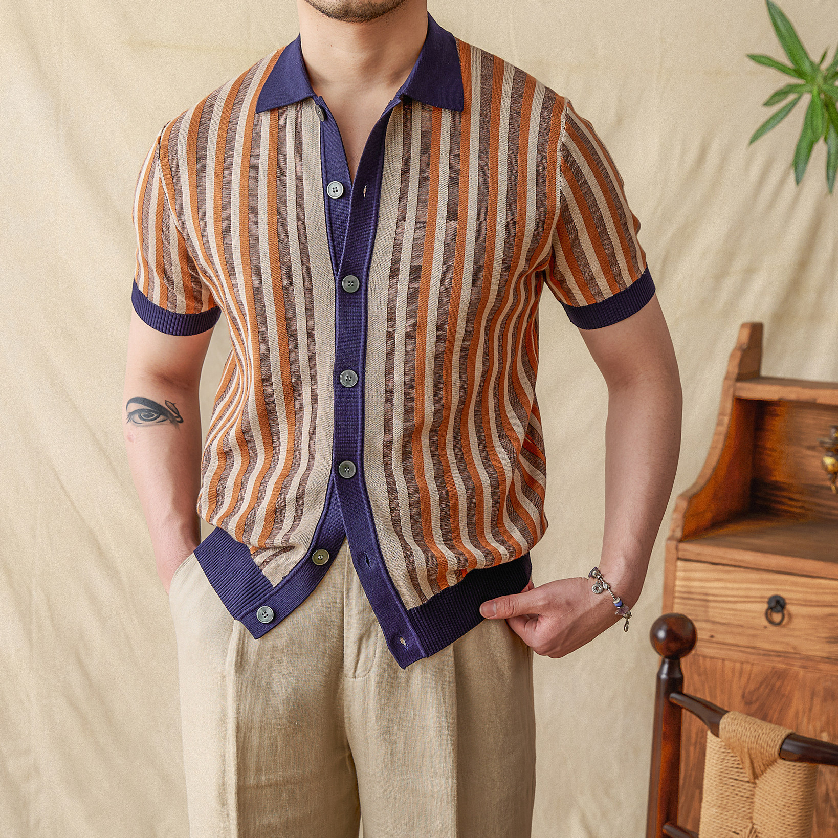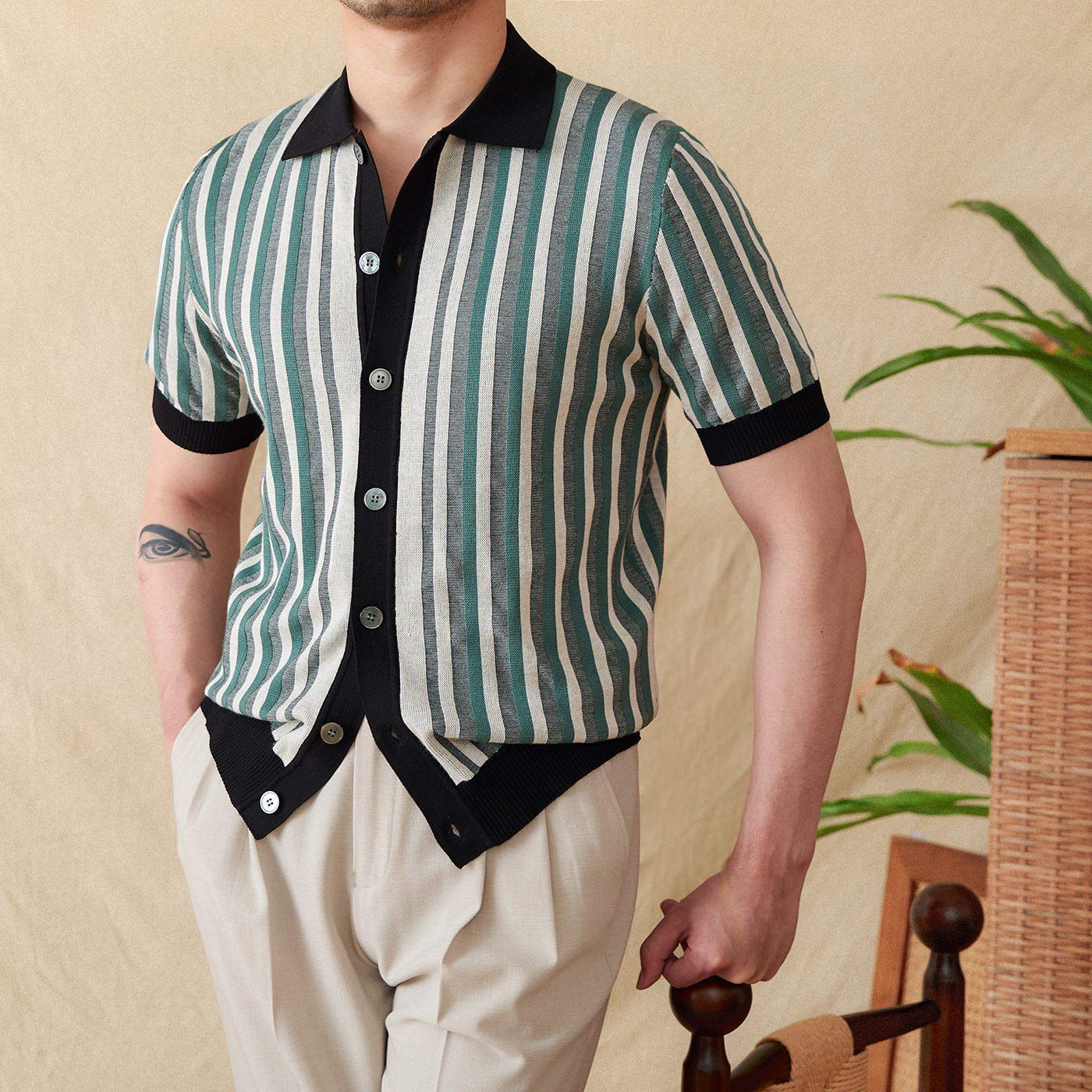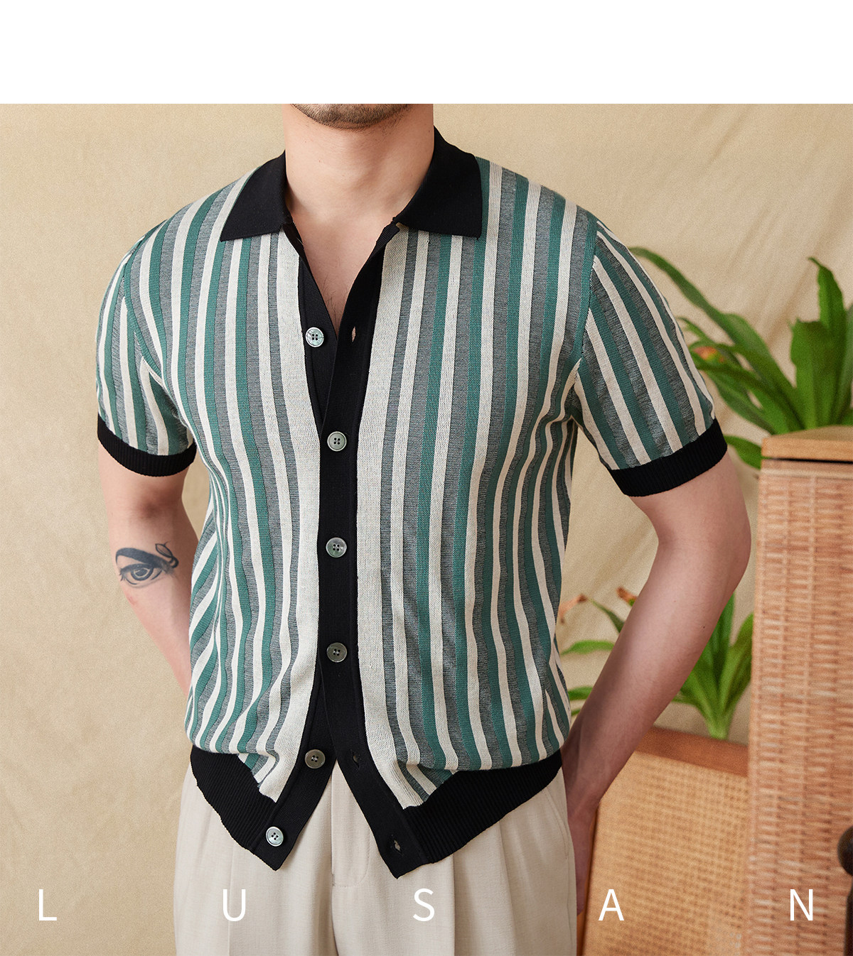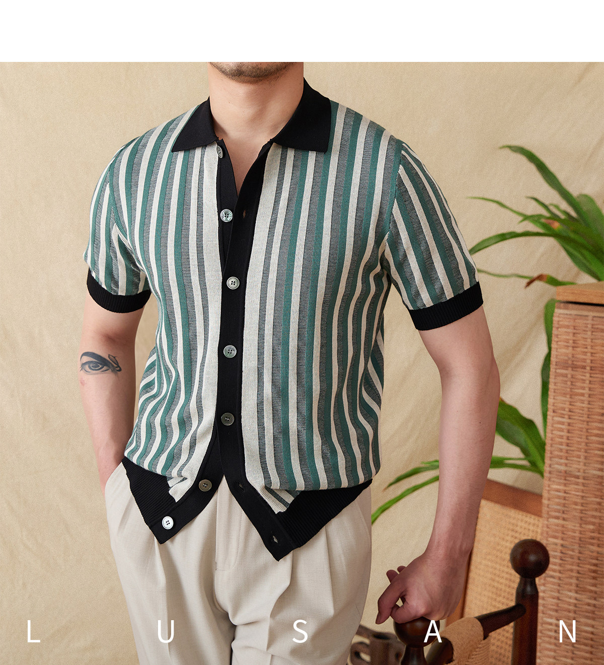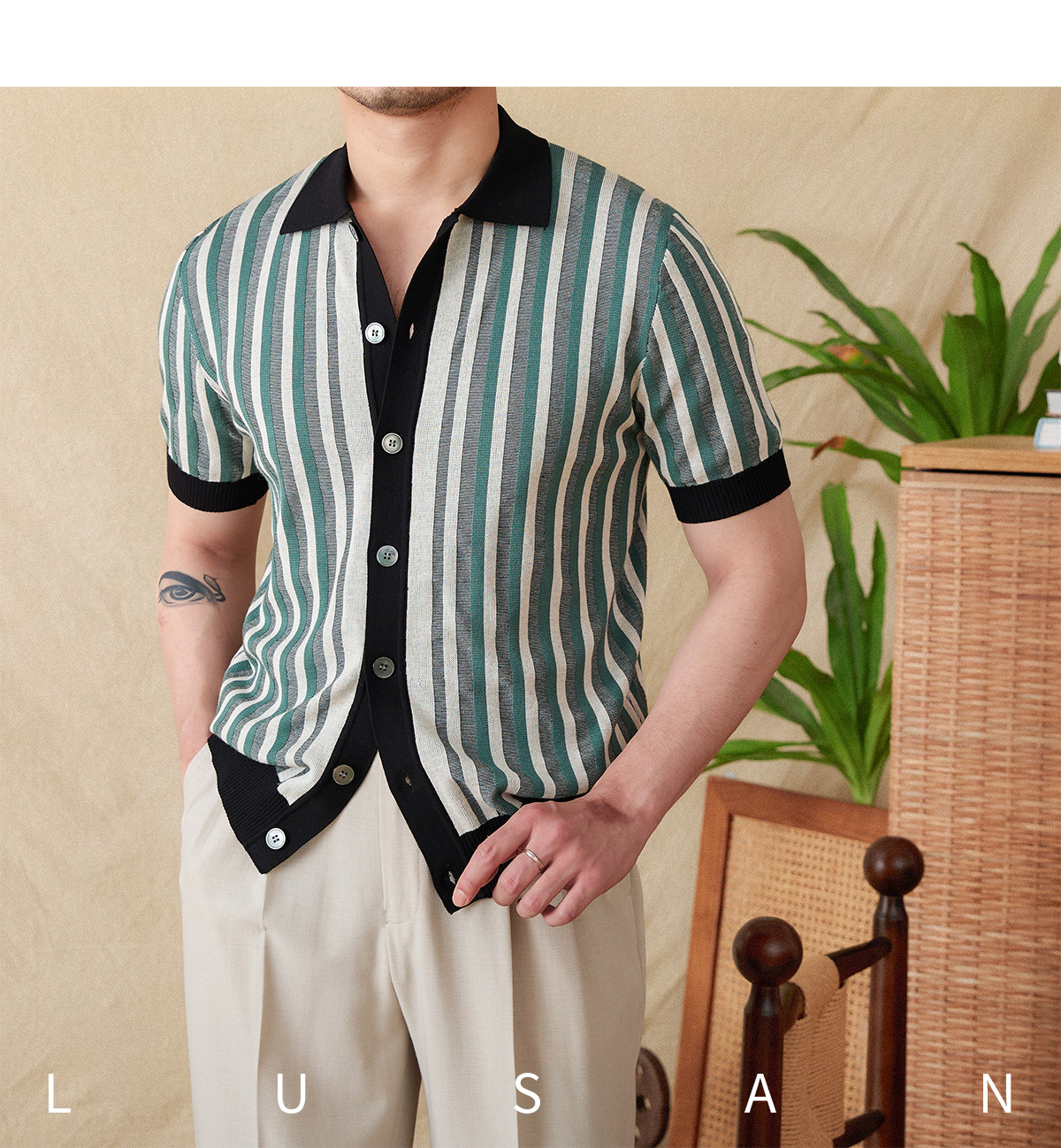 Мистер Лу Сан итальянский летний лацкат полосатый жаккардовый свитер сплайсинга в британском рубашке с коротки