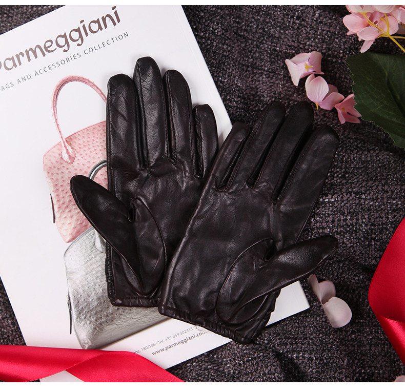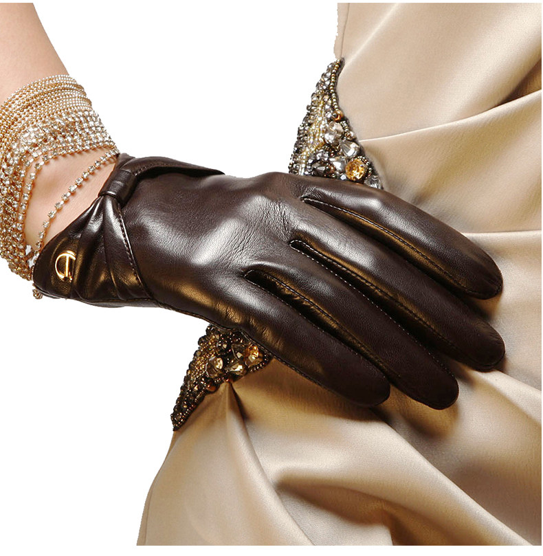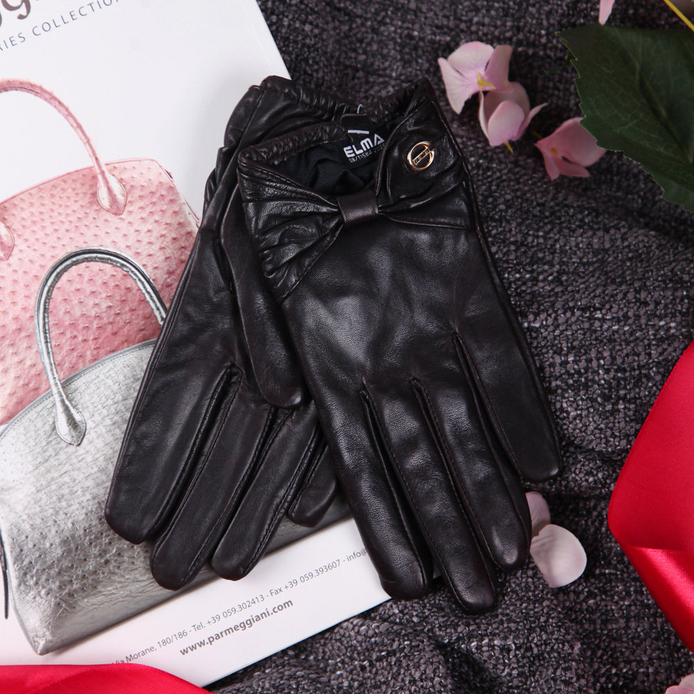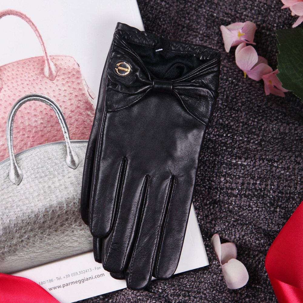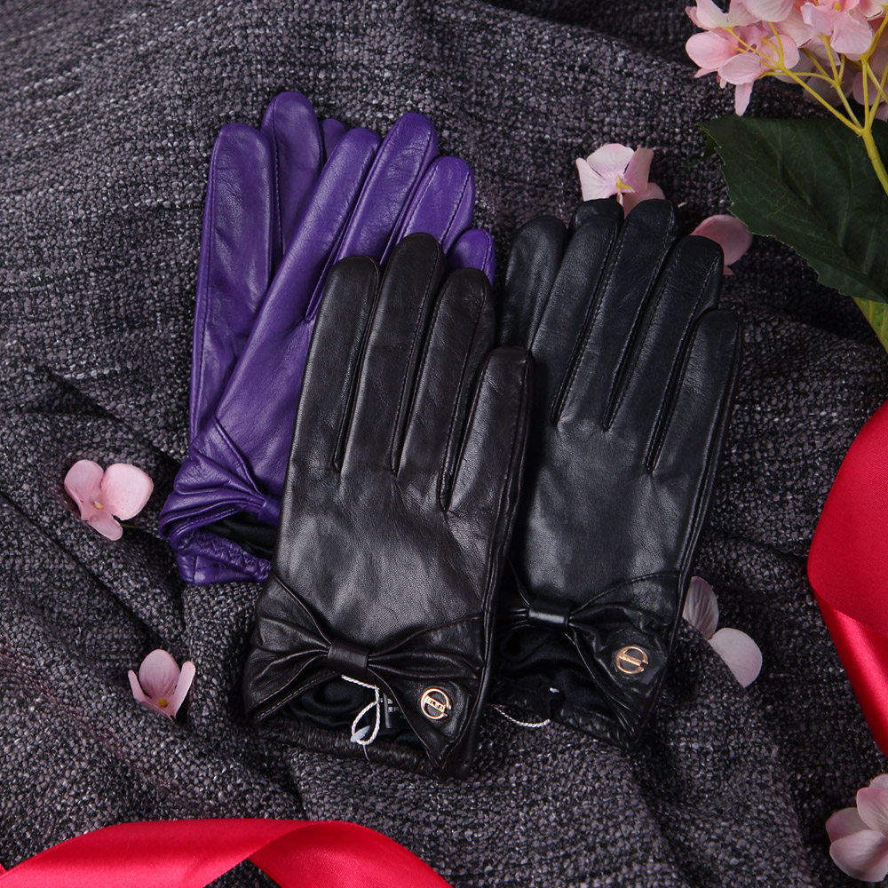 Зимние тонкие короткие удерживающие тепло перчатки с бантиком, из натуральной кожи