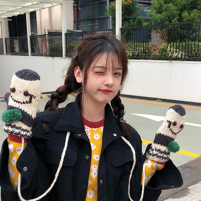 Шерстяные перчатки, удерживающий тепло милый флисовый мультяшный трикотажный комплект для школьников, увеличенная толщина, в корейском стиле