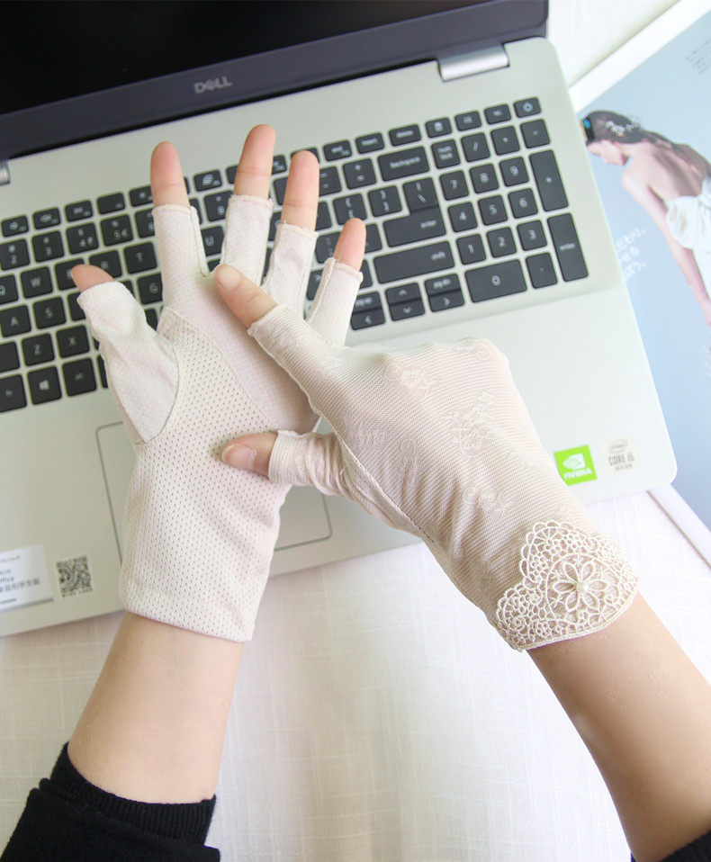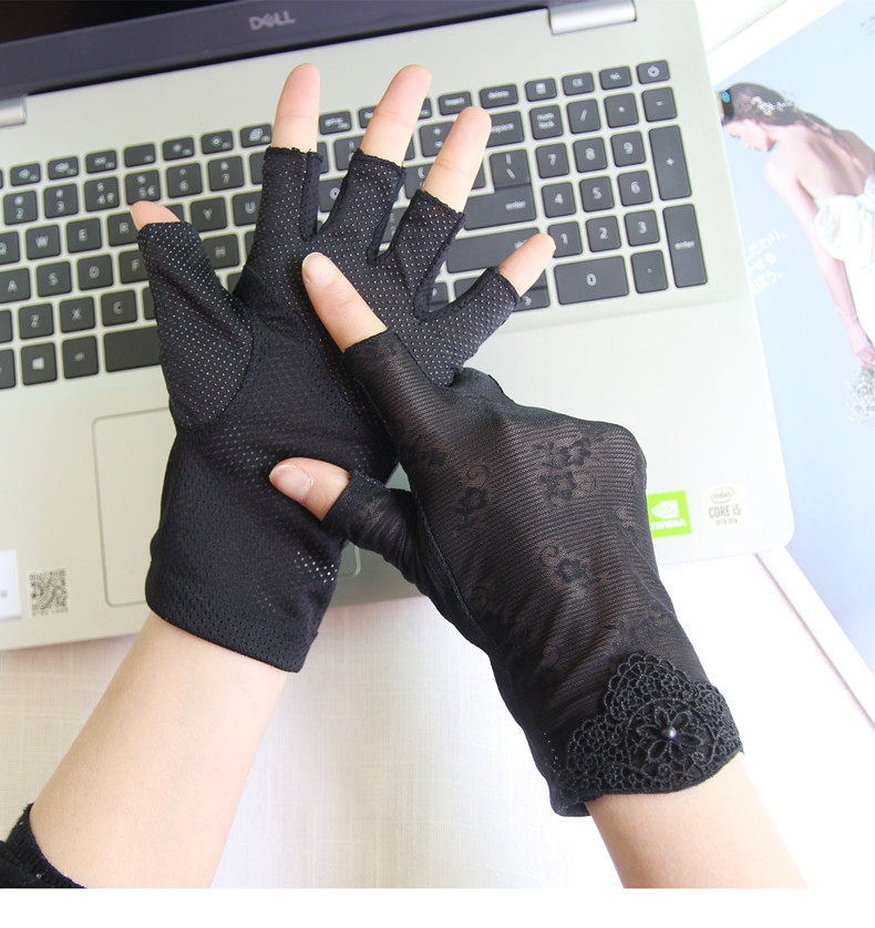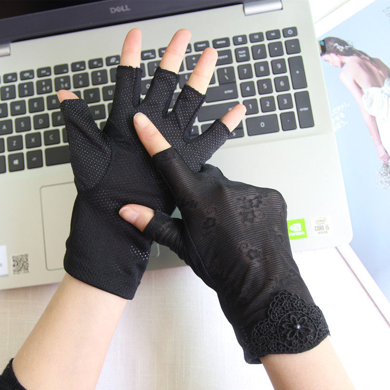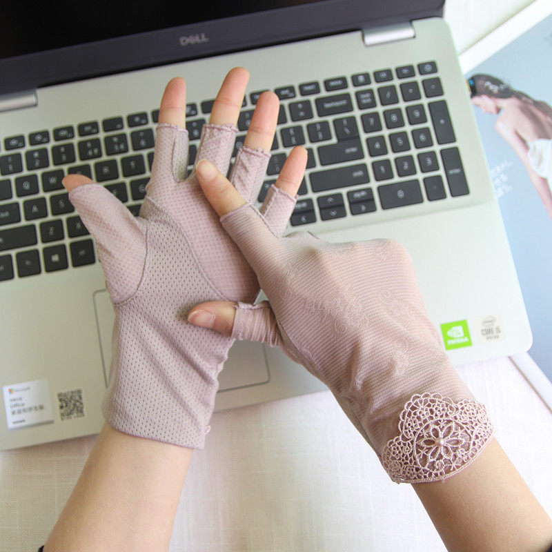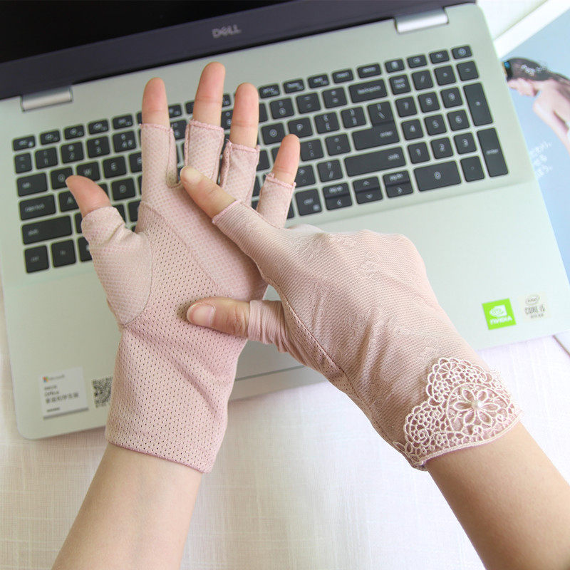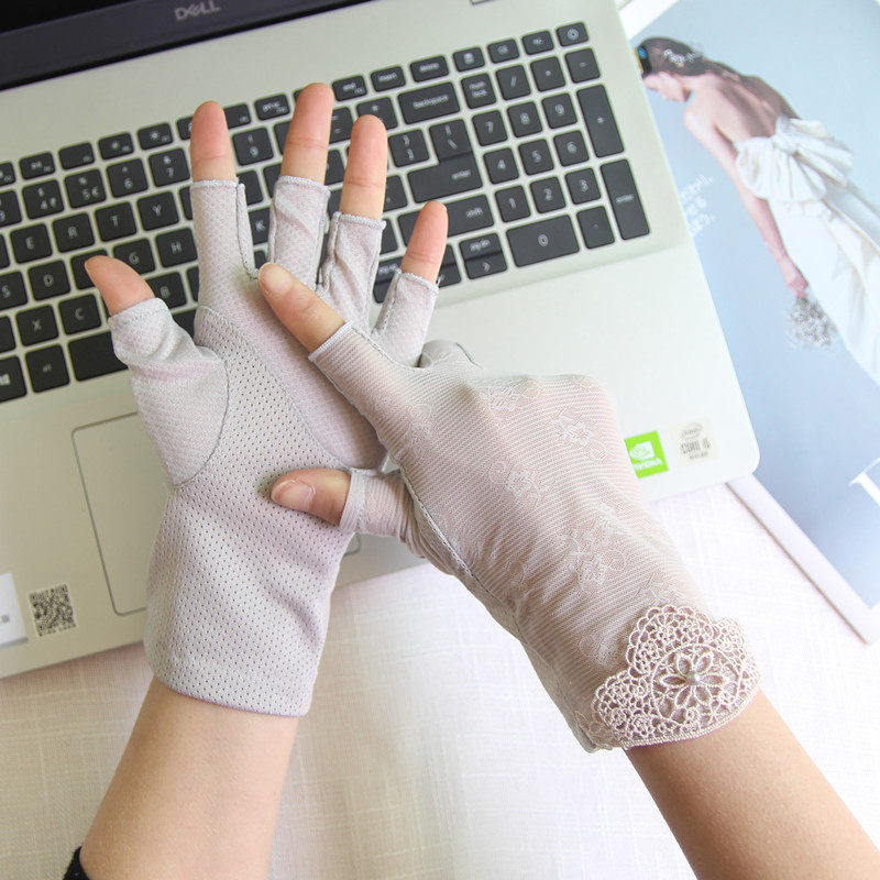 Перчатки, тонкий кружевной шелковый нескользящий дорожный короткий весенний летний комплект, защита от солнца, без пальцев