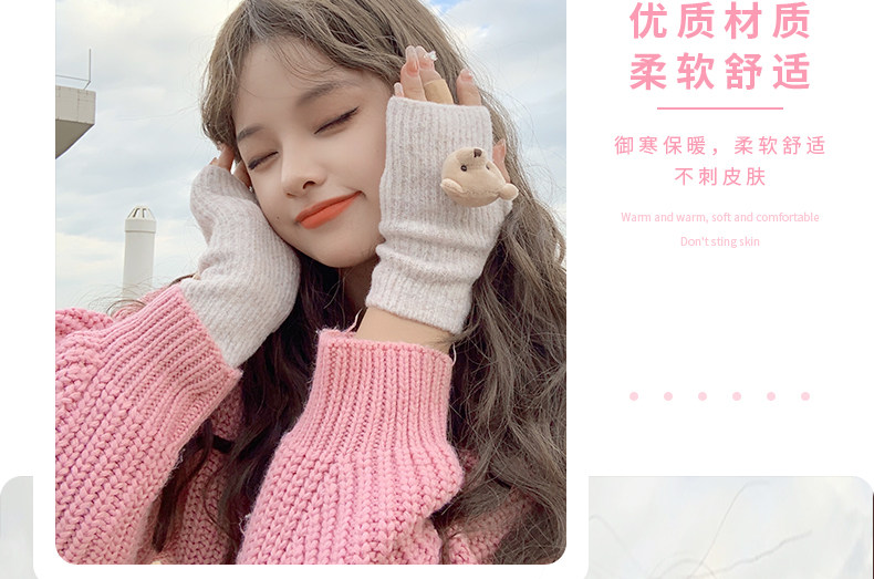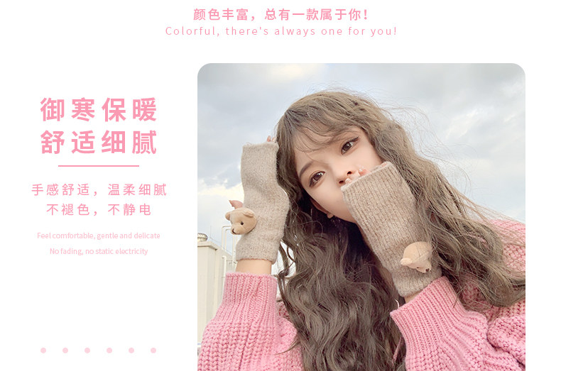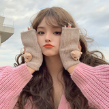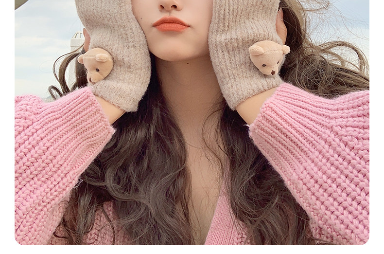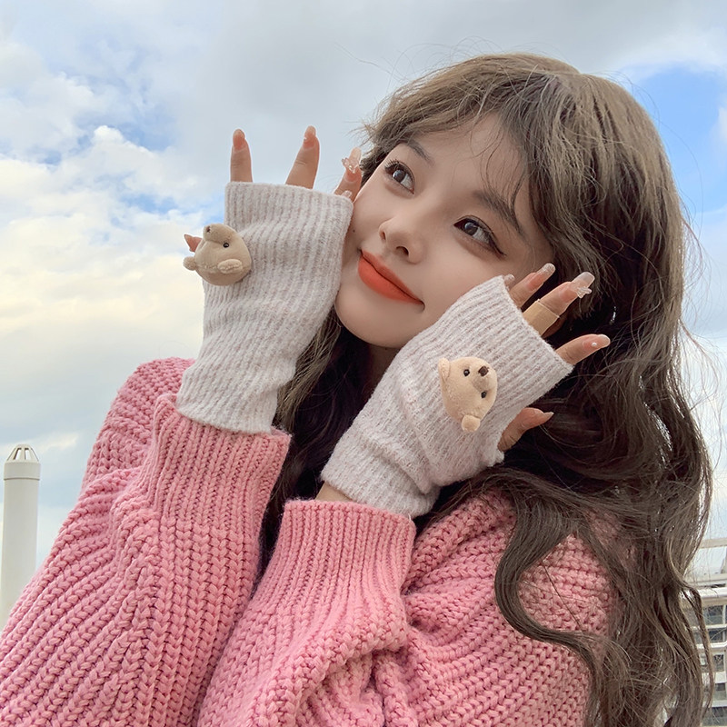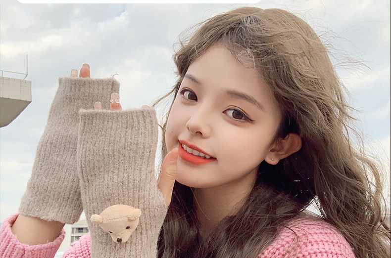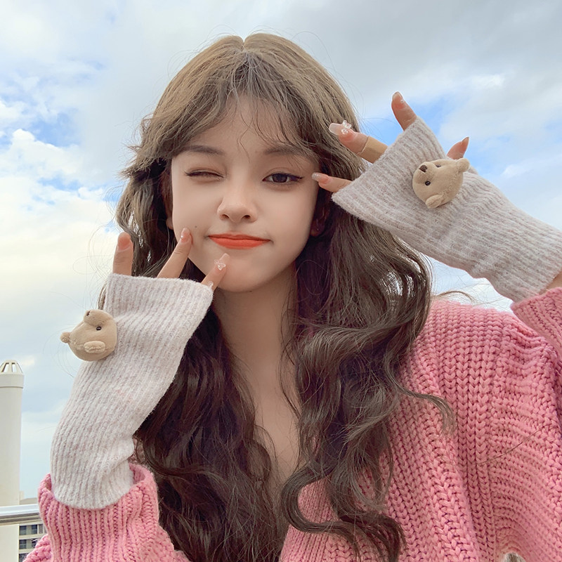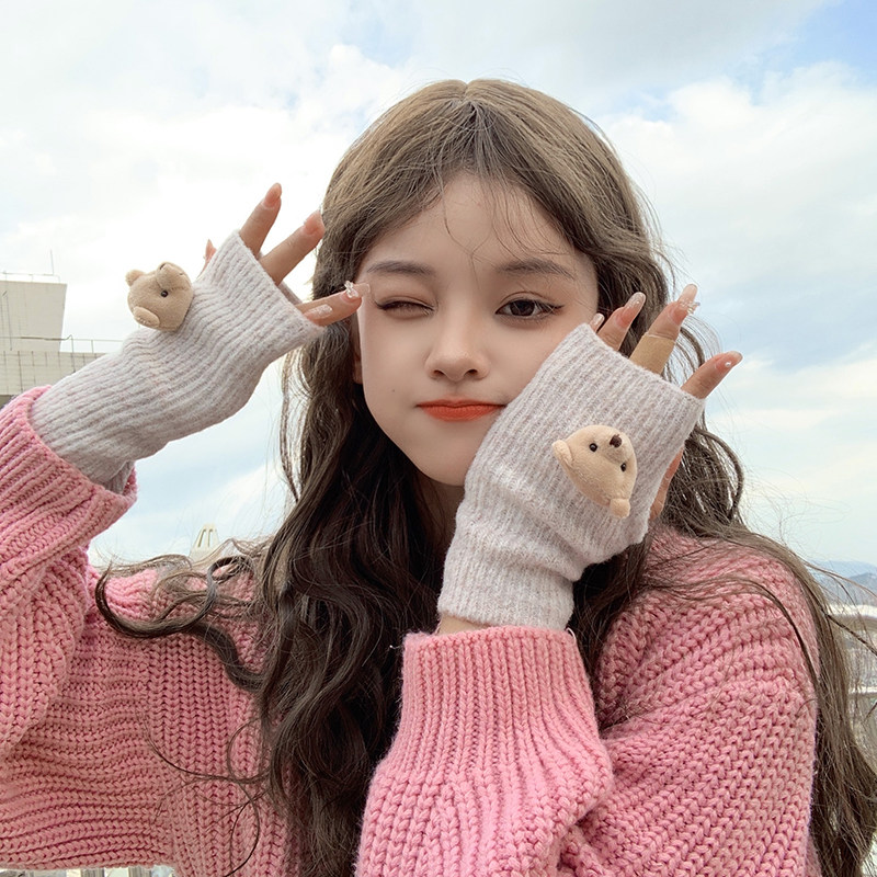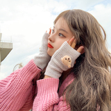 Милые шерстяные трикотажные демисезонные перчатки, японский удерживающий тепло комплект, с медвежатами, без пальцев