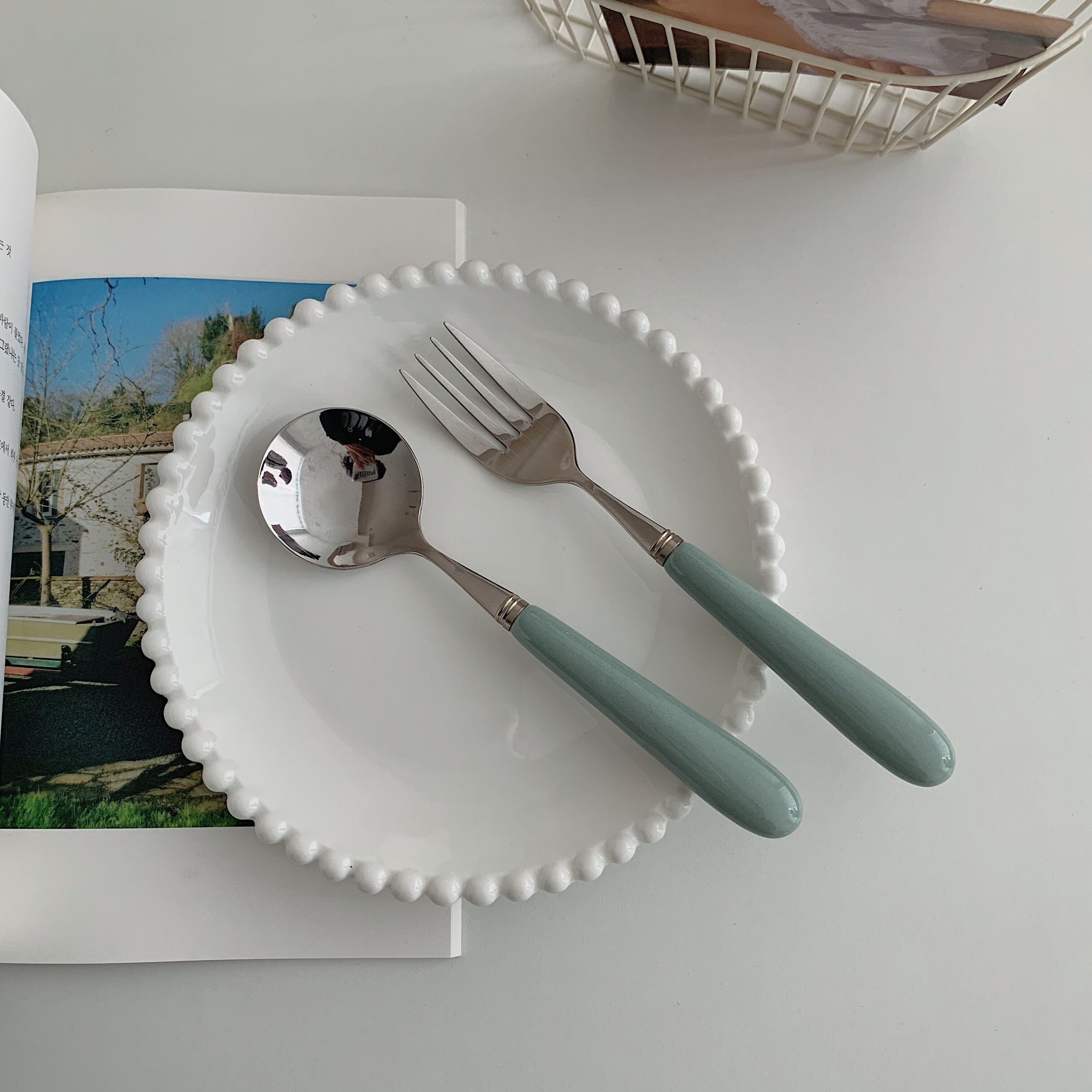 Ретро комплект, керамическая вилка, ложка, хлеб, кот