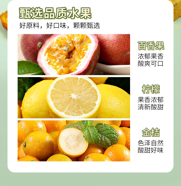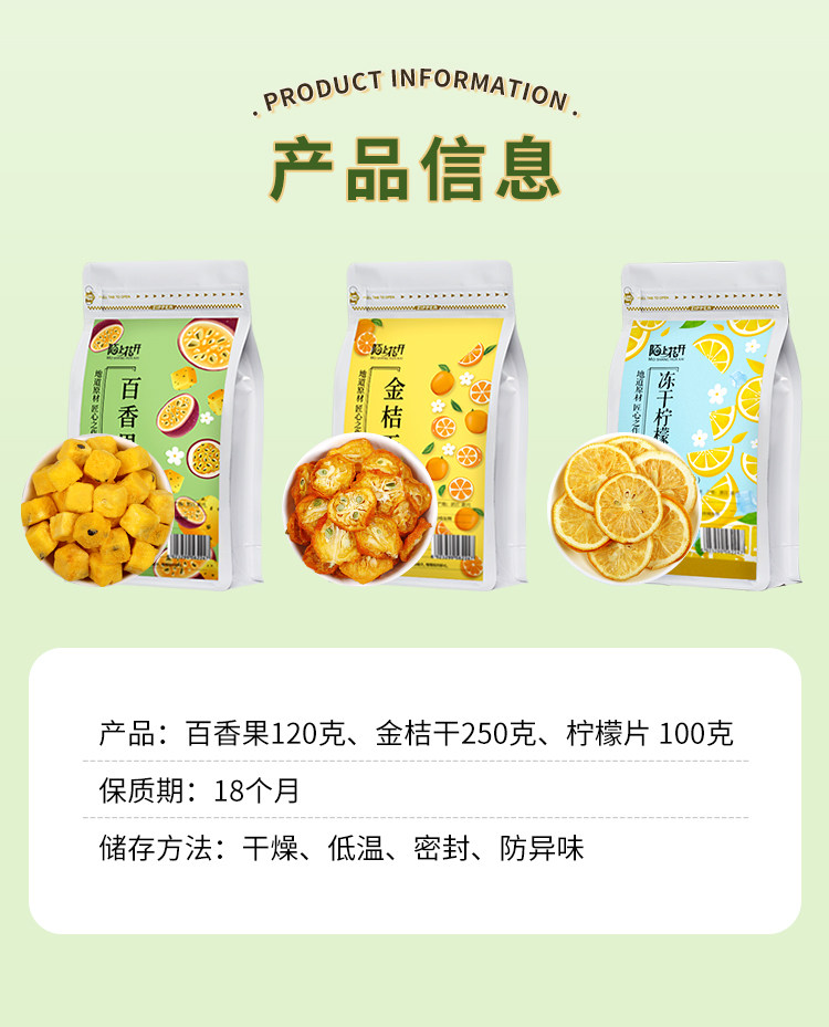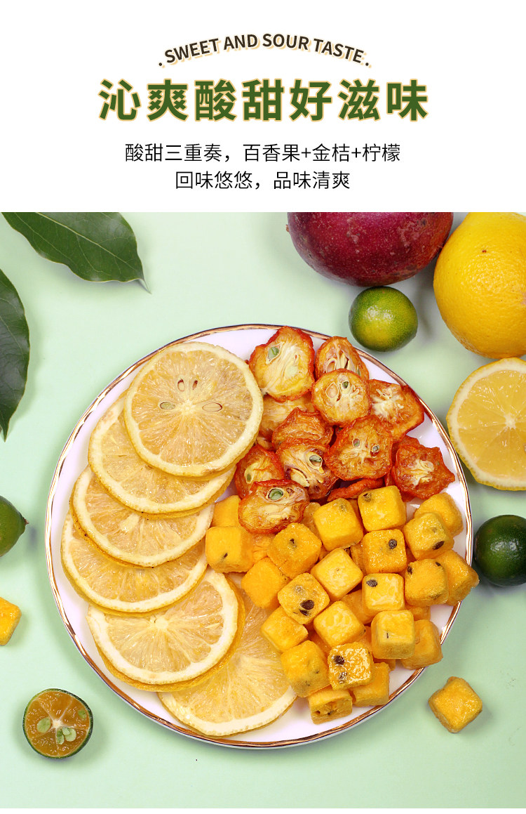 | Вкус: | Кумкват + сублимированные ломтики лимона + маракуйя, 250 г сушеный сумка Kumquat, 100 г замороженных лимонных таблеток, 120 г сумка для маракуйи |