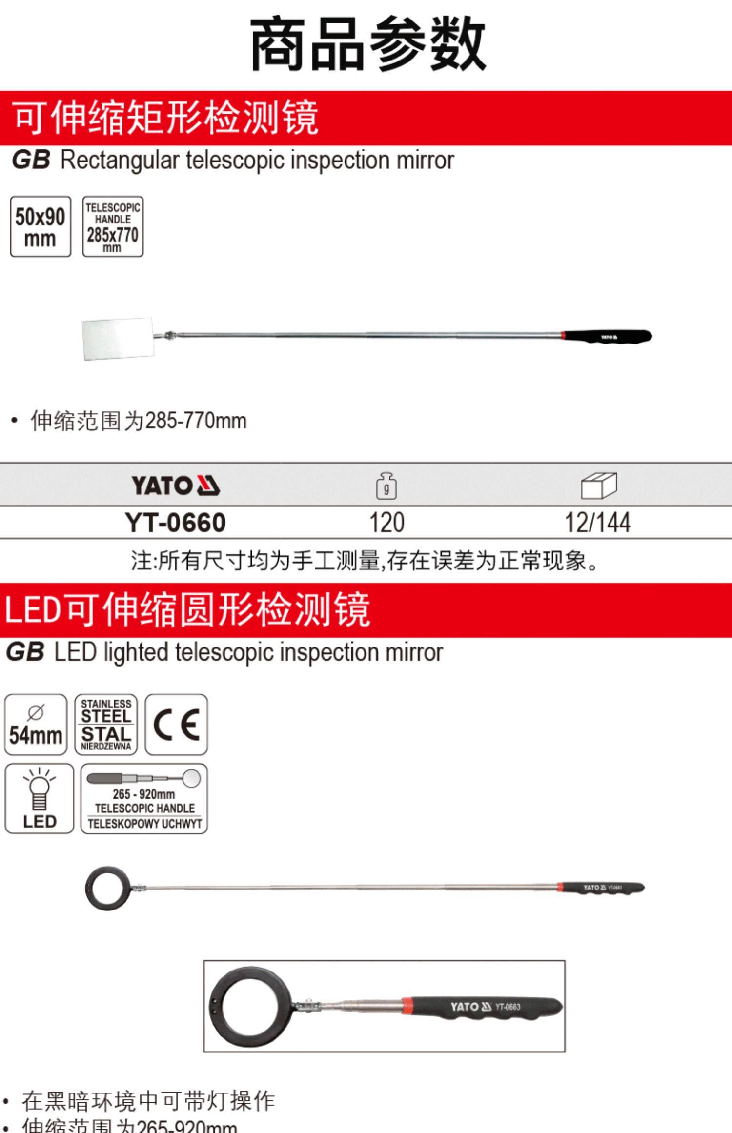 | Цвет: | Извлечение прямоугольного зеркала обнаружения 50x90 мм YT-0660, Светодиодный выдвижной круговой обнаружение диаметр 54 мм YT-0663 |