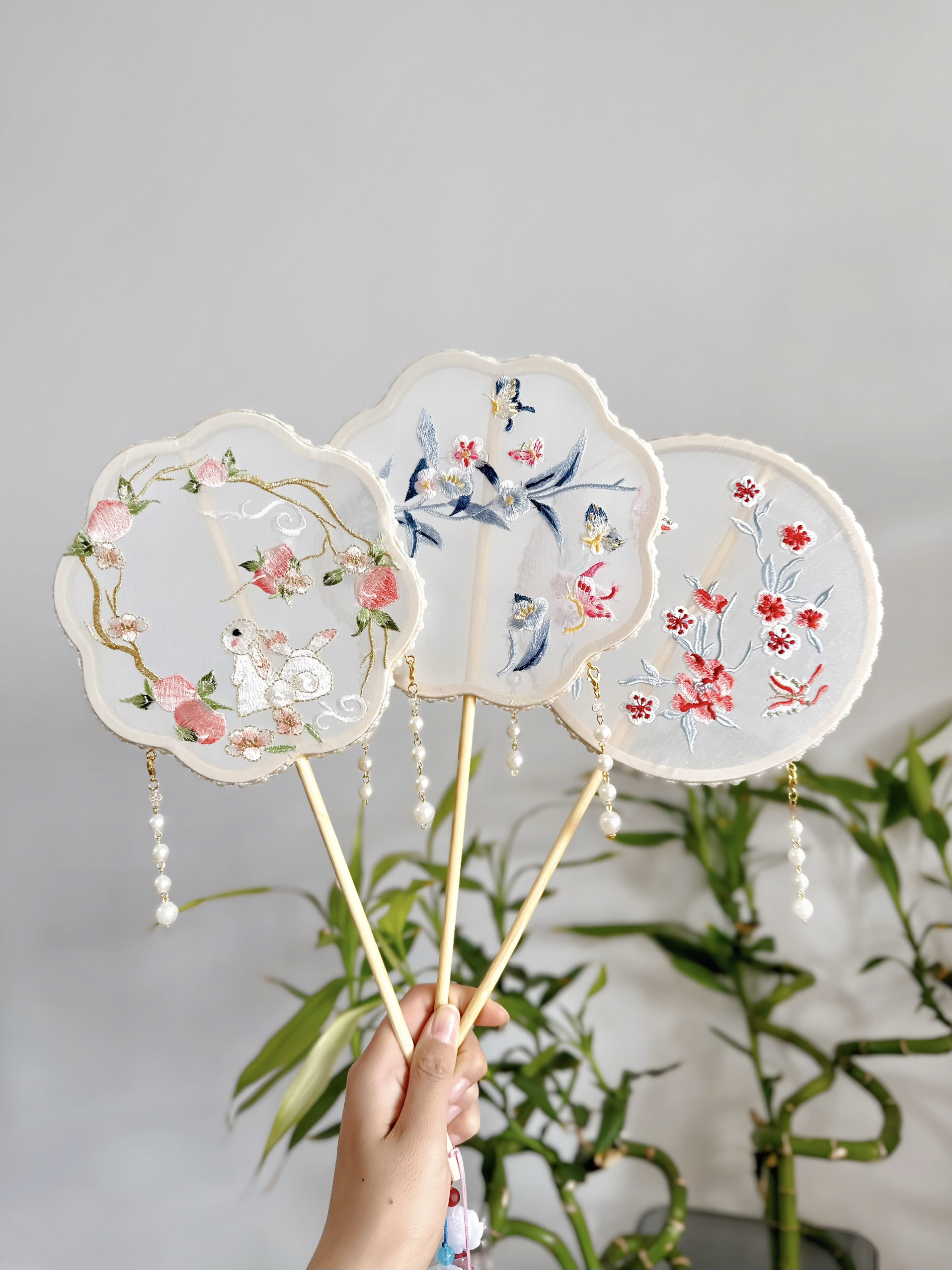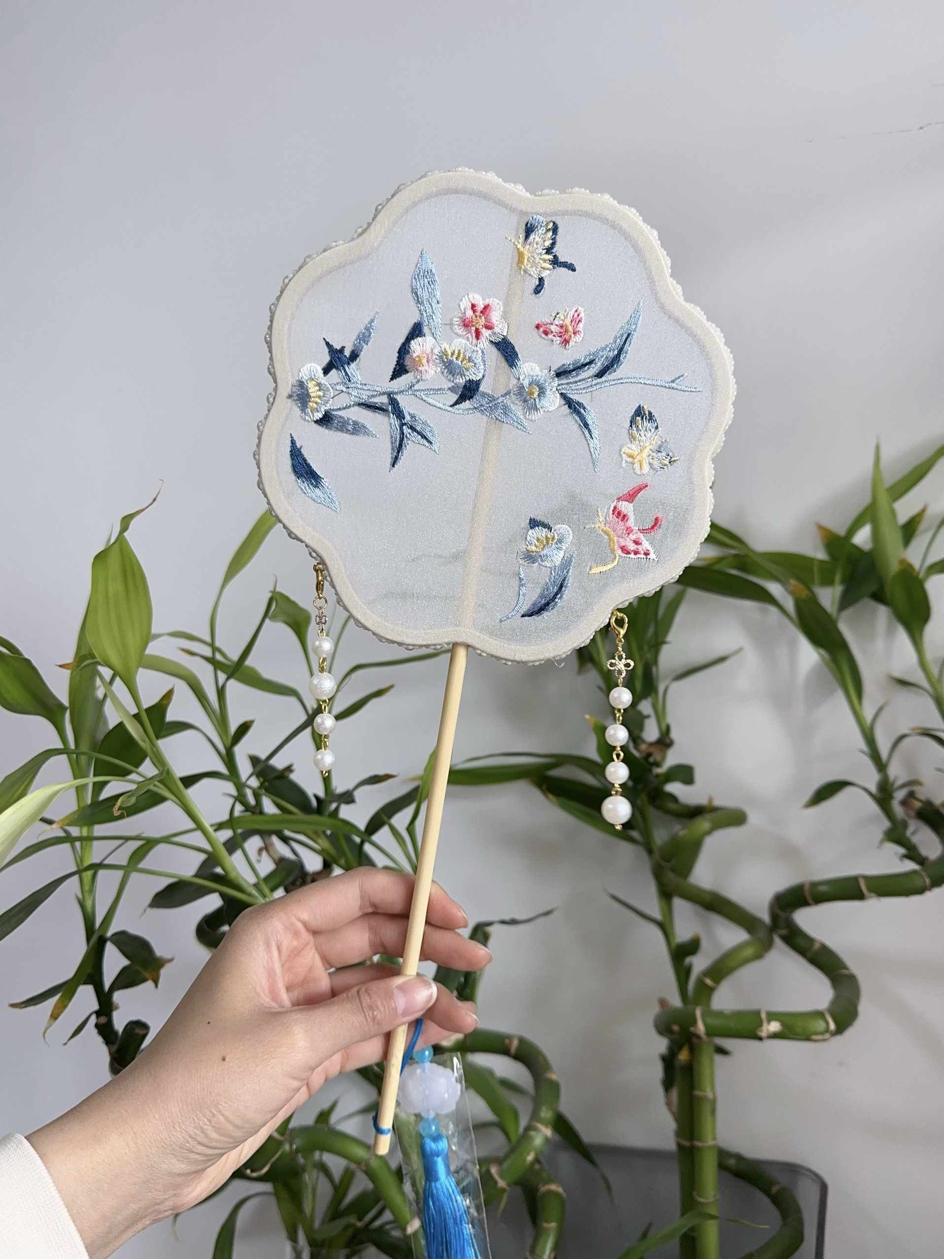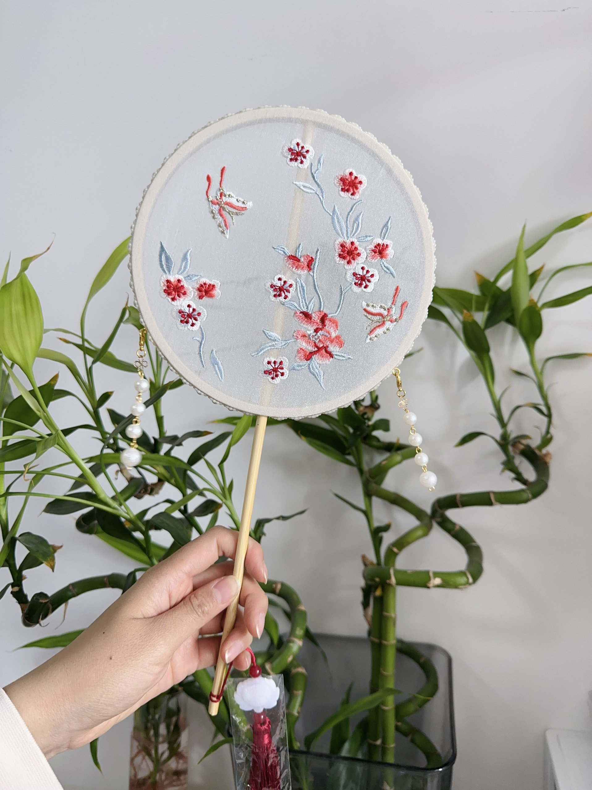 Вышитый круглый вентилятор с новым годом фото Hanfu Retro New китайский стиль вентилятор вентилятор бамбук с длинной ручкой бессмертный цветок ручной работы ручной работы ручной работы
