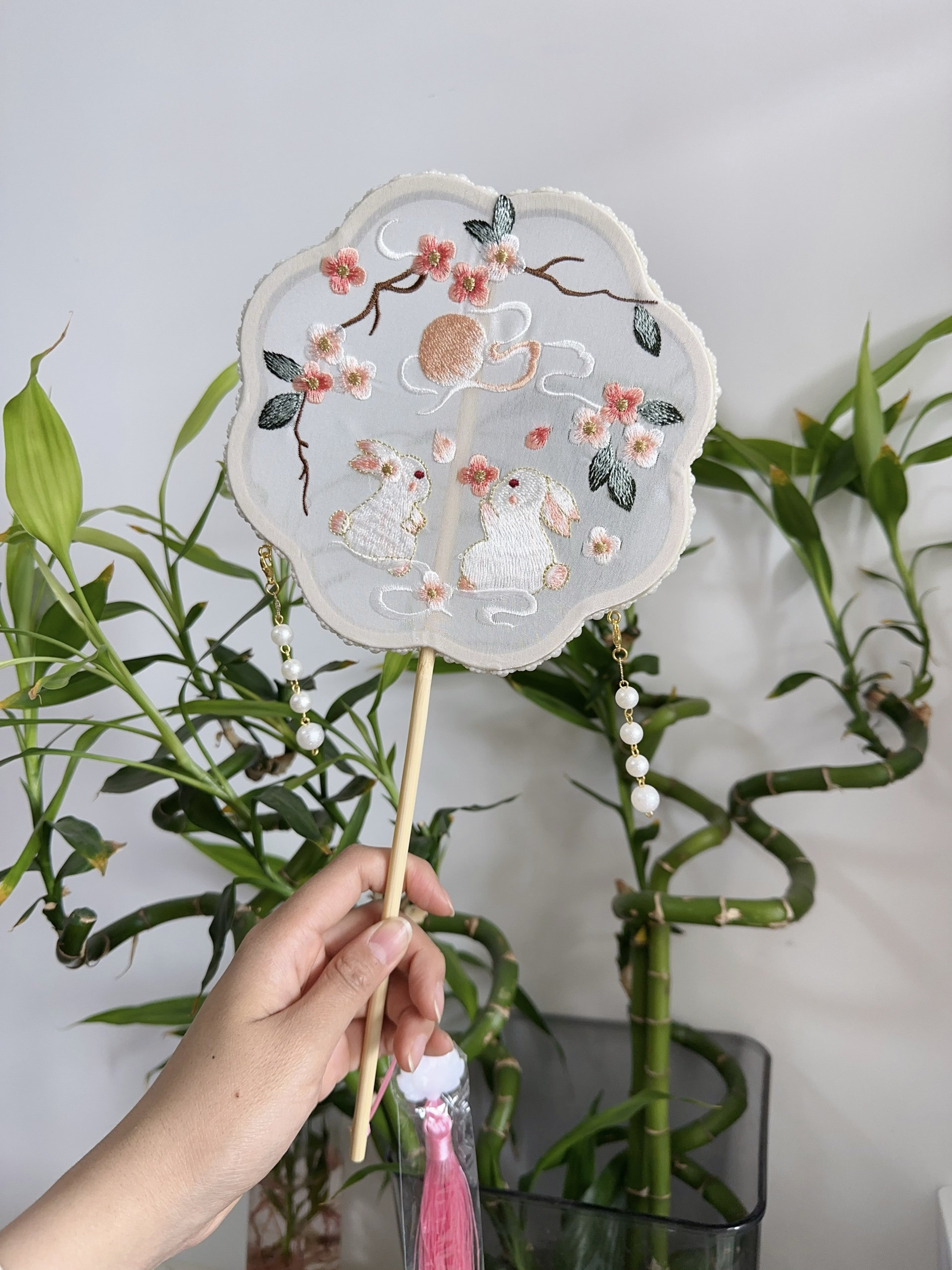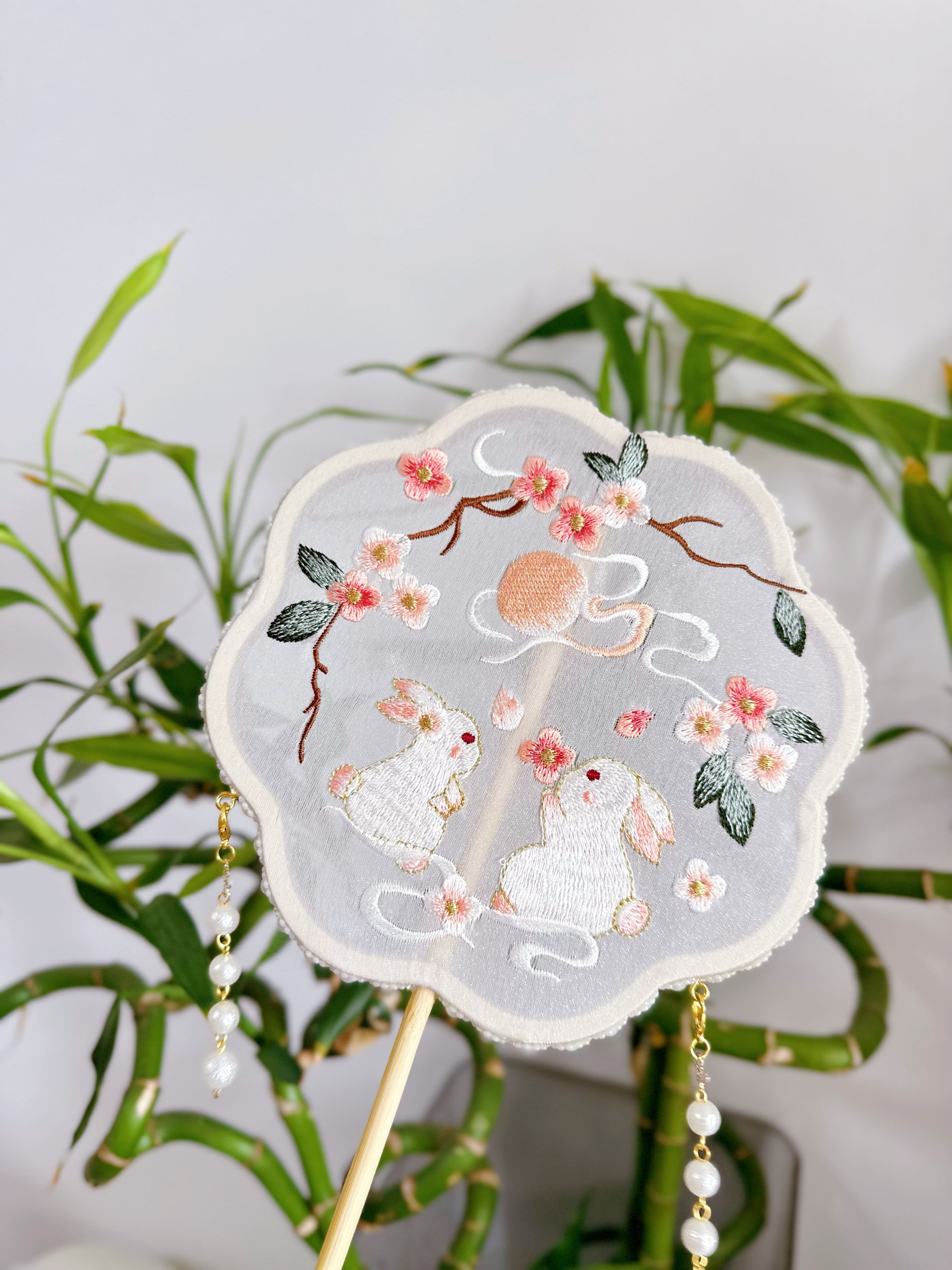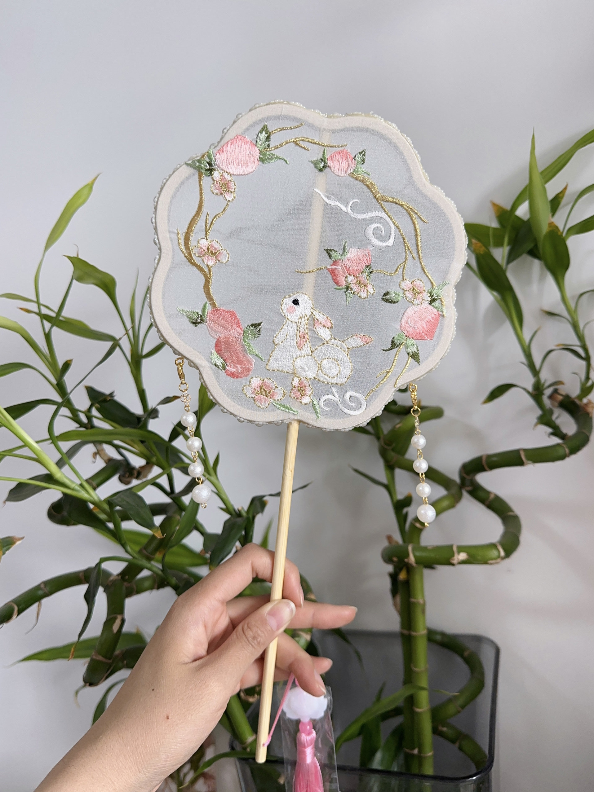 Вышитый круглый вентилятор с новым годом фото Hanfu Retro New китайский стиль вентилятор вентилятор бамбук с длинной ручкой бессмертный цветок ручной работы ручной работы ручной работы