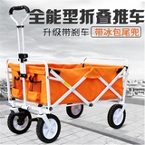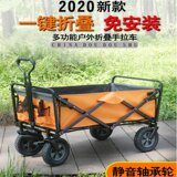 Складной багажный автомобиль на открытом воздухе. Походный водитель толкает машину, чтобы вытащить автомобиль для кемпинга, и установите стойло для удобного пикника пожилых людей