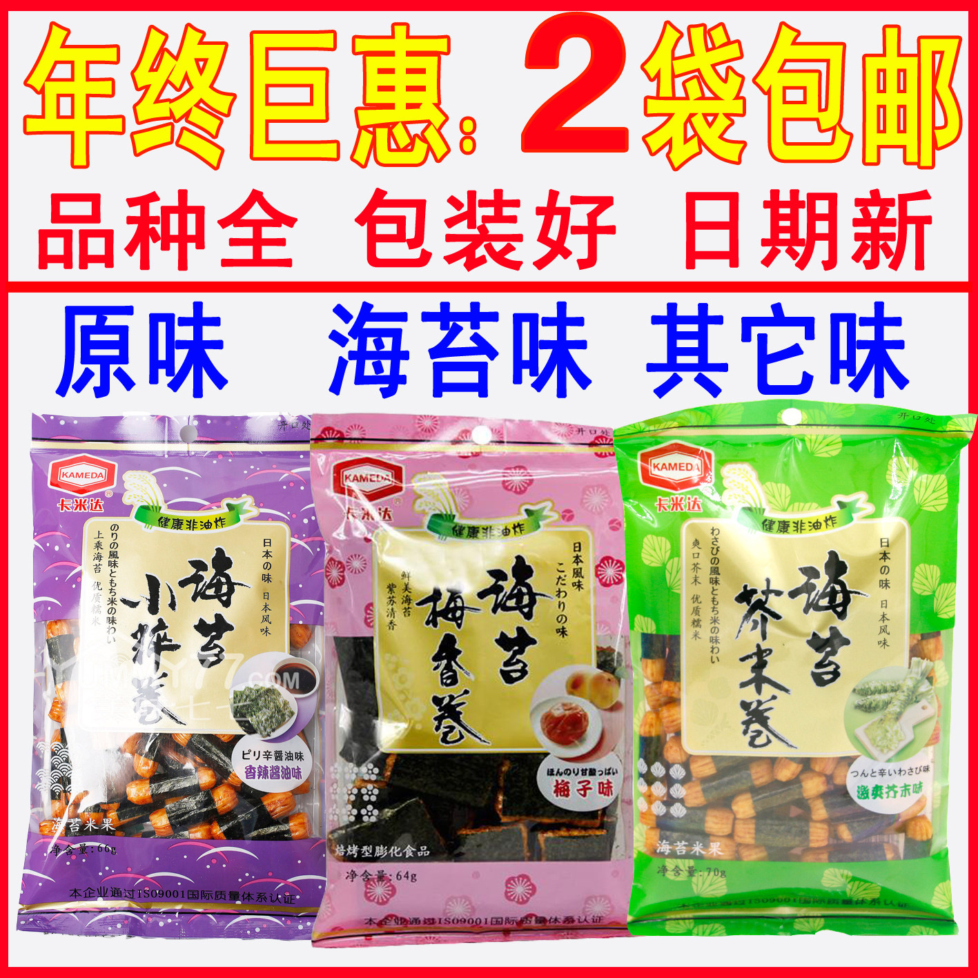 Серия рисовых крекеров с морскими водорослями: [Острый вкус соевого соуса](Маленький пакет 35 г/большой пакет 66 г)【Захватывающий вкус горчицы】(Большая сумка 70 г), также есть [Рулет с ароматом водорослей и сливы](Кисло-сладкий сливовый вкус, маленький пакетик и большой пакетик, 64 г);