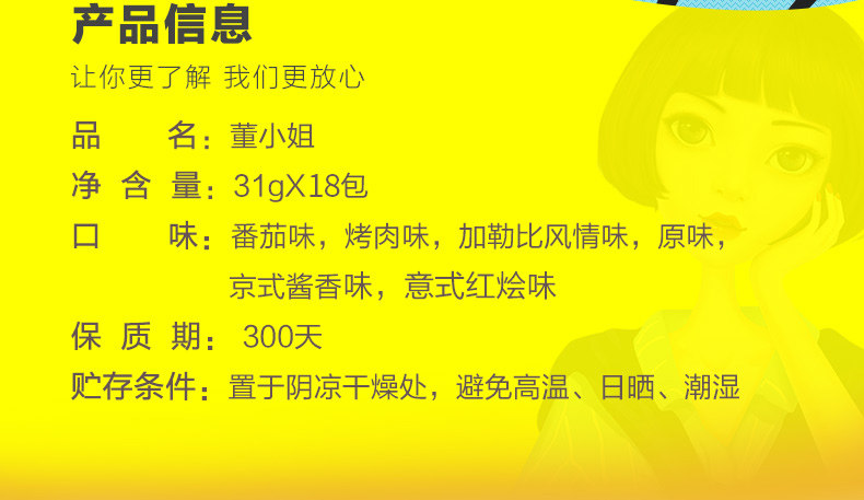 | Вкус: | 18 пакетов мягкого оригинального вкуса, Вкус соуса в Пекине 18 упаковки, 18 упаковок аромата барбекю, Томатный вкус 18 упаковков, Карибский стиль 18 пакетов, Итальянский красный аромат 18 упаковка, 6 ароматов, смешанных с 18 упаковками |