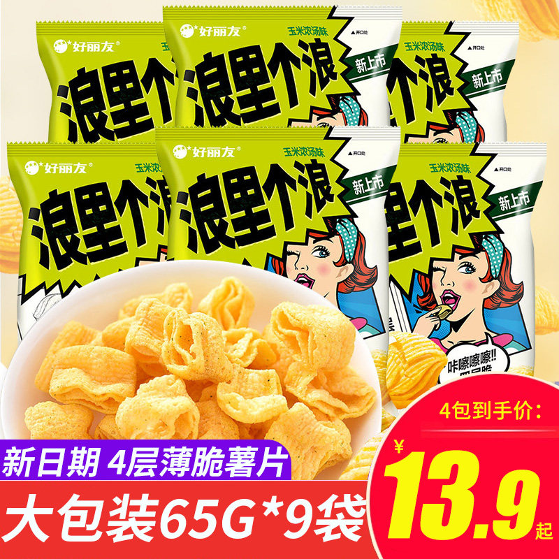 Хорошие картофельные чипсы Liyou, волновые картофельные чипсы 4 слоя 65 г*9 пакетов раствора барбекю с кукурузными омарами, питательные закуски желудка