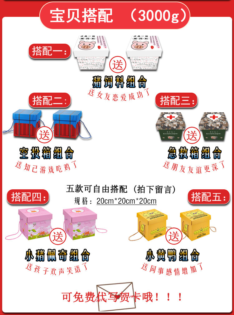 | Вкус: | Свиньем корм + маленькая желтая утка (всего 100 упаковок), Ты принадлежишь мне + мой маленький предок (всего 100 упаковок), Подарочная коробка детства + корм для свиньи (всего 100 упаковок), Случайная комбинация (сфотографирована и оставила сообщение) |