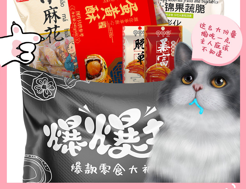 Разбивая кошачья подарочная сеть сеть красная еда, полная голода и ночных девушек, закуски смешанные подарки на случайные блюда.