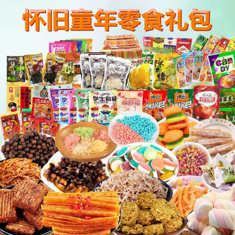 Воспоминания детства после 8090 года, закуски, ностальгические конфеты, старомодные подарочные пакеты с пряными полосками, неповторяющаяся столовая, детский кампус