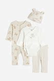 Комплект из мягкого хлопкового трикотажа.Комбинезон с длинными рукавами украшен застежками спереди, спускающимися по штанам, и узкой окантовкой на манжетах и подоле.Блуза с длинными рукавами имеет запах спереди и кнопки по бокам и в промежности для легкой смены подгузников.Леггинсы имеют широкие откидные вставки на талии для удобного прилегания к животу.Шапка-бини украшена аппликациями в виде ушек сверху и двойной окантовкой по краям.