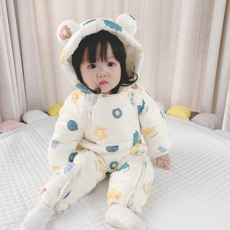 Зимняя детская милая стеганая толстовка с капюшоном, флисовое удерживающее тепло боди для девочек для выхода на улицу, в цветочек, увеличенная толщина