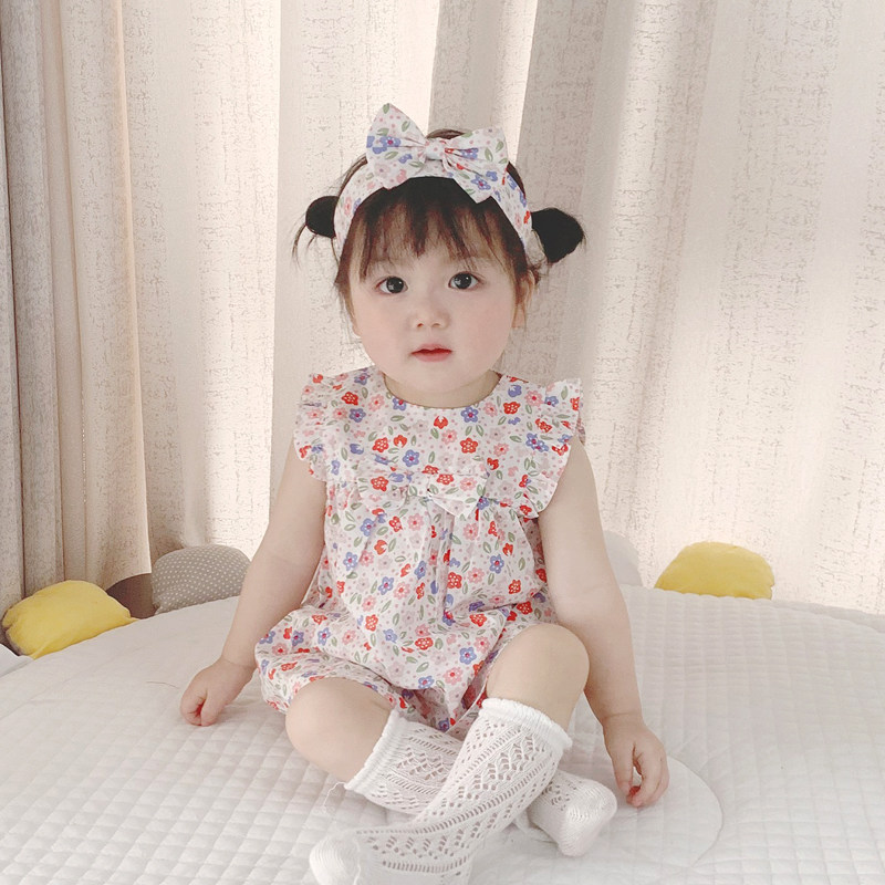 Брендовая летняя детская летняя одежда без рукавов, хлопковые шорты, повязка на голову для девочек, комплект, в корейском стиле, цветочный принт, 3 предмета