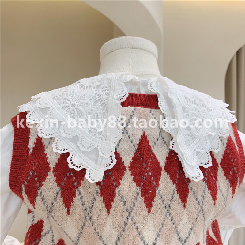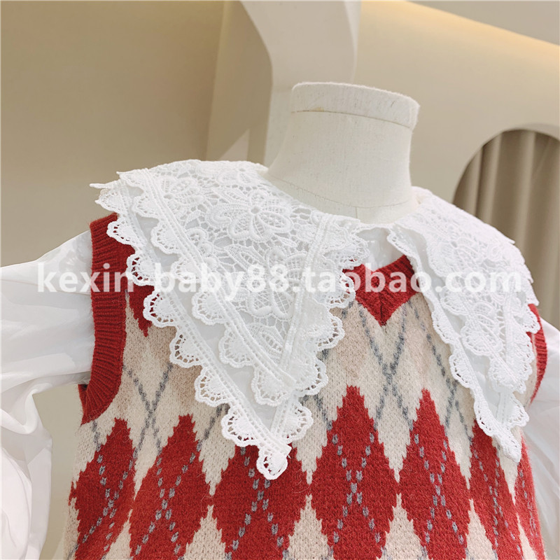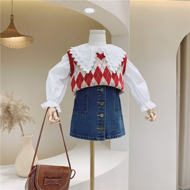 Осенняя кружевная рубашка с ромбовидным узором, трикотажный жилет, лак для ногтей, джинсовая юбка, 2020 года