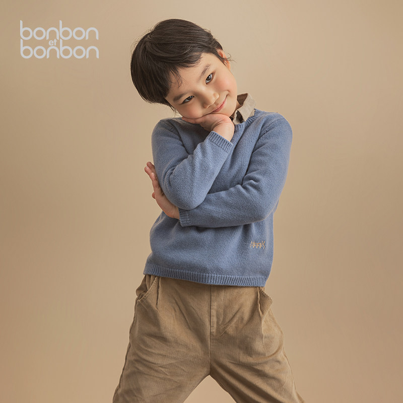 Bonbon et Bonbon Детский классический воротник вышитый цветочный свитер Pure Wool Sweater Blue