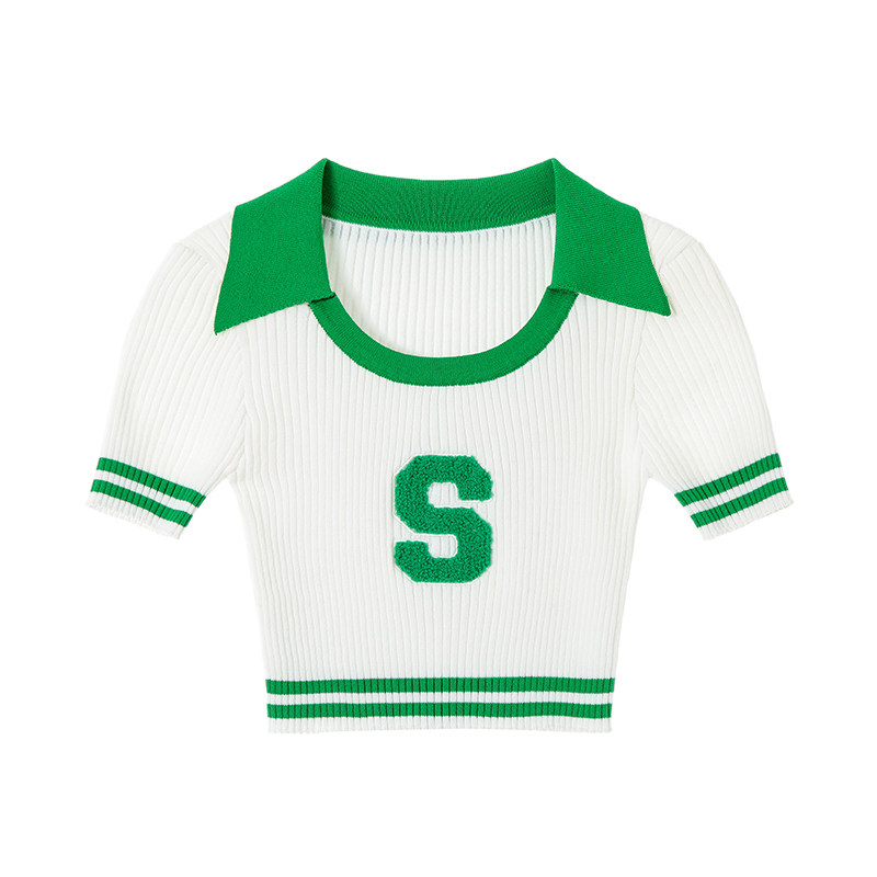 Sasakids U-Collar Polo вышитый с двумя вязальными вязаными вязальными девчонками Летний ретро-ретро-универсальный топ