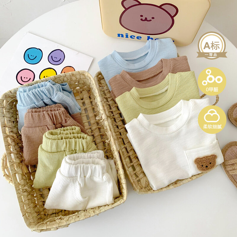 Брендовая летняя тонкая летняя одежда, раздельный комплект подходит для мужчин и женщин для девочек, с медвежатами, короткий рукав, 0-2 лет