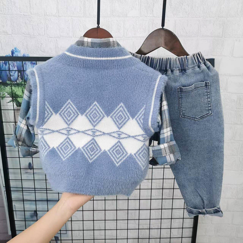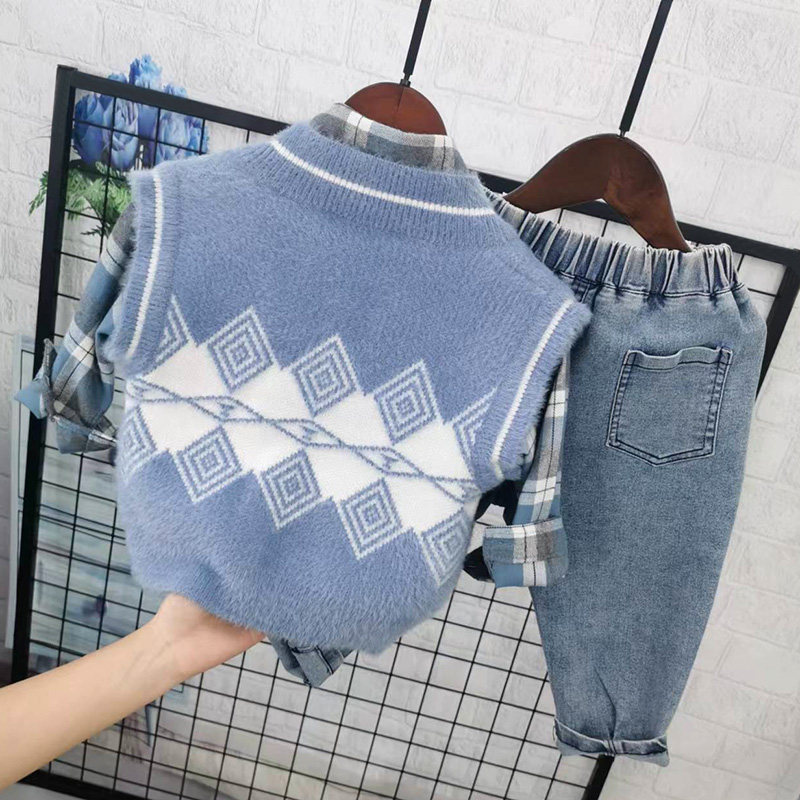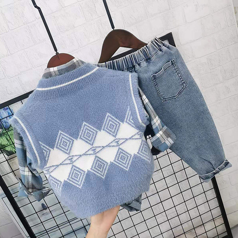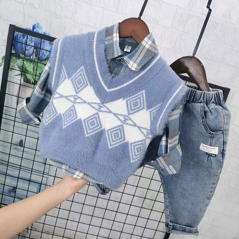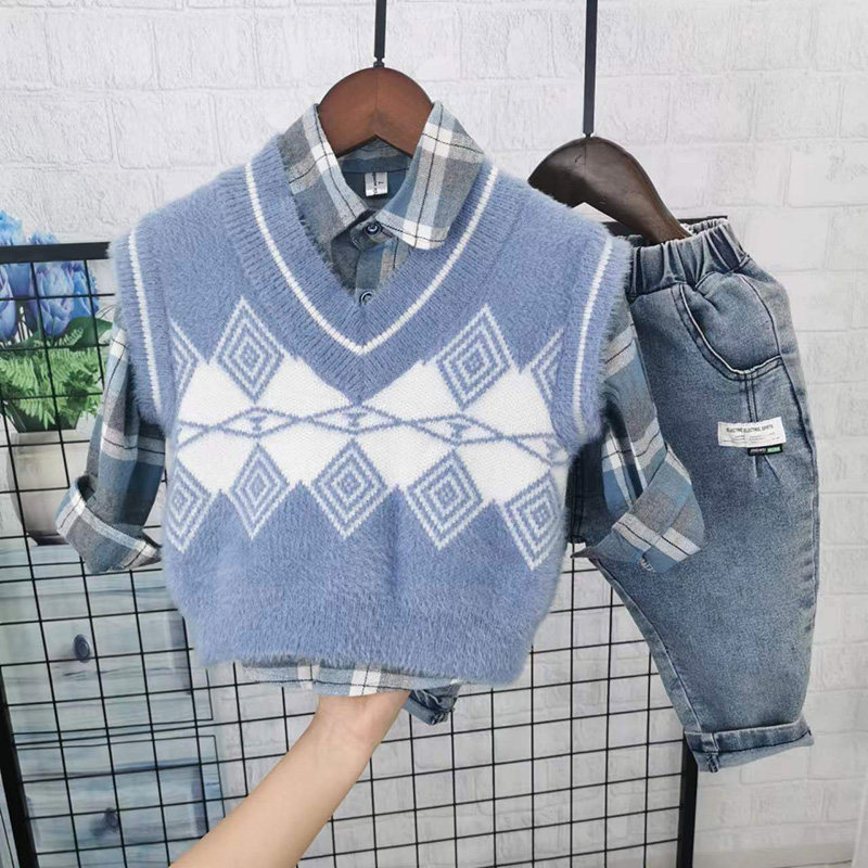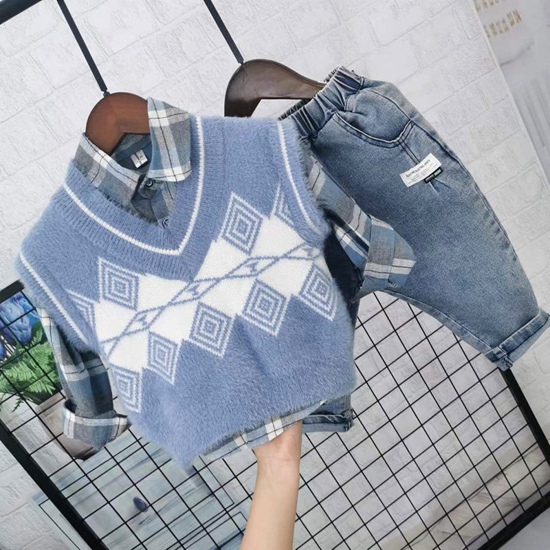 Осенний комплект для мальчиков, свитер, жилет, рубашка, детские джинсы, в западном стиле, 3 предмета