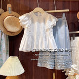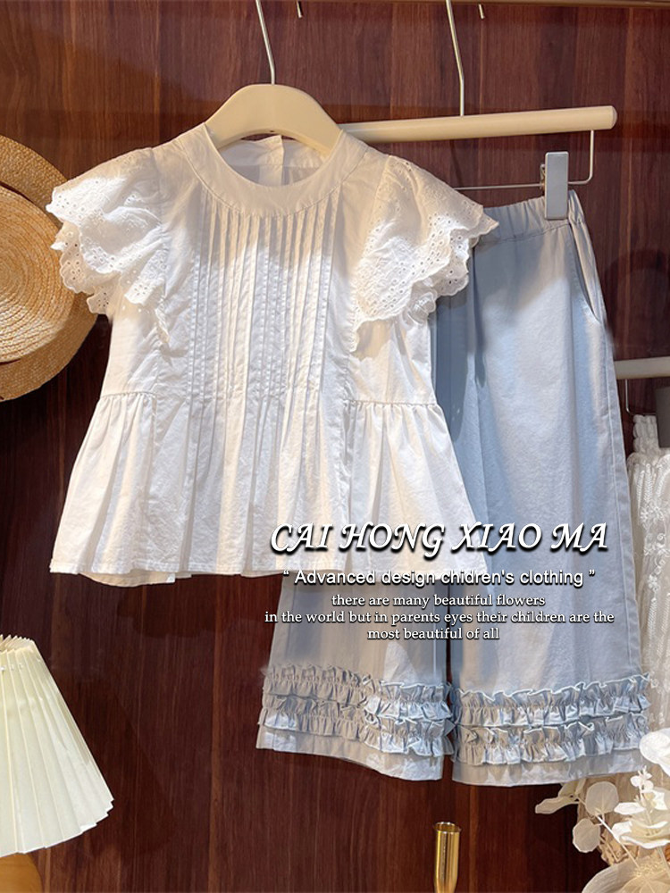 Летняя одежда, кружевной комплект для девочек, футболка, комбинезон, штаны, в корейском стиле, детская одежда, в западном стиле, кружевное платье