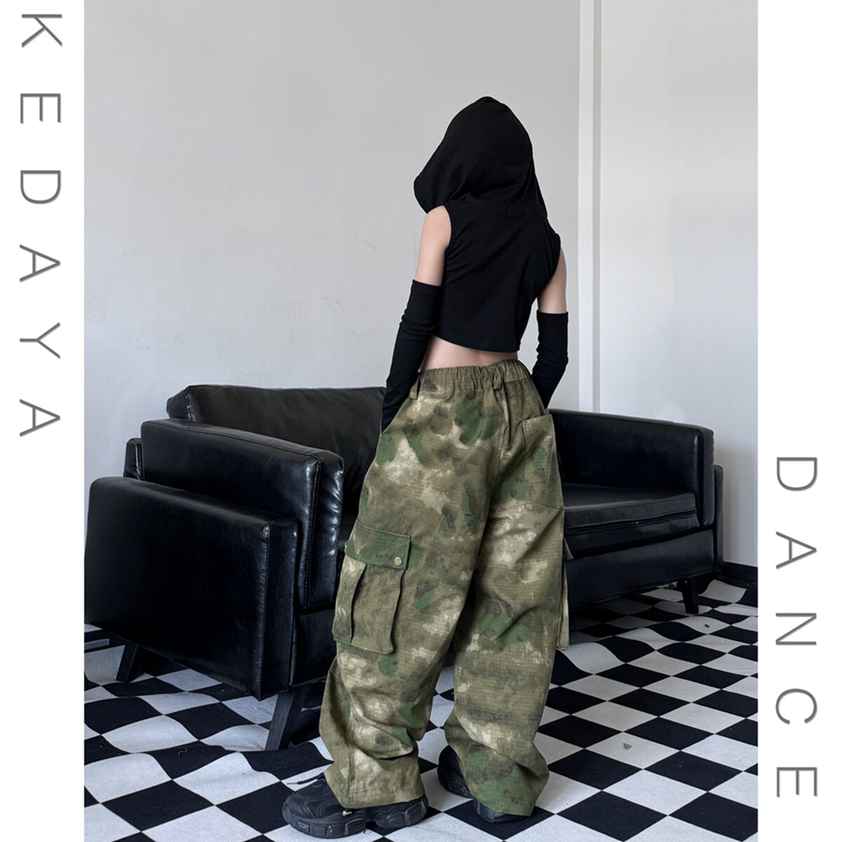 - Черный жилет с капюшоном, камуфляжные штаны
