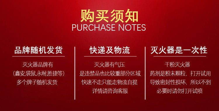 ОгнетушительОдноразовый, После вытяжения рынка, вы должны использовать его за один раз, а затем использовать его снова, чтобы заполнить газ и сухой порошок.Поэтому при получении товара, пожалуйста, обязательно проверьте поверхность экспресса или логистики после получения товара.