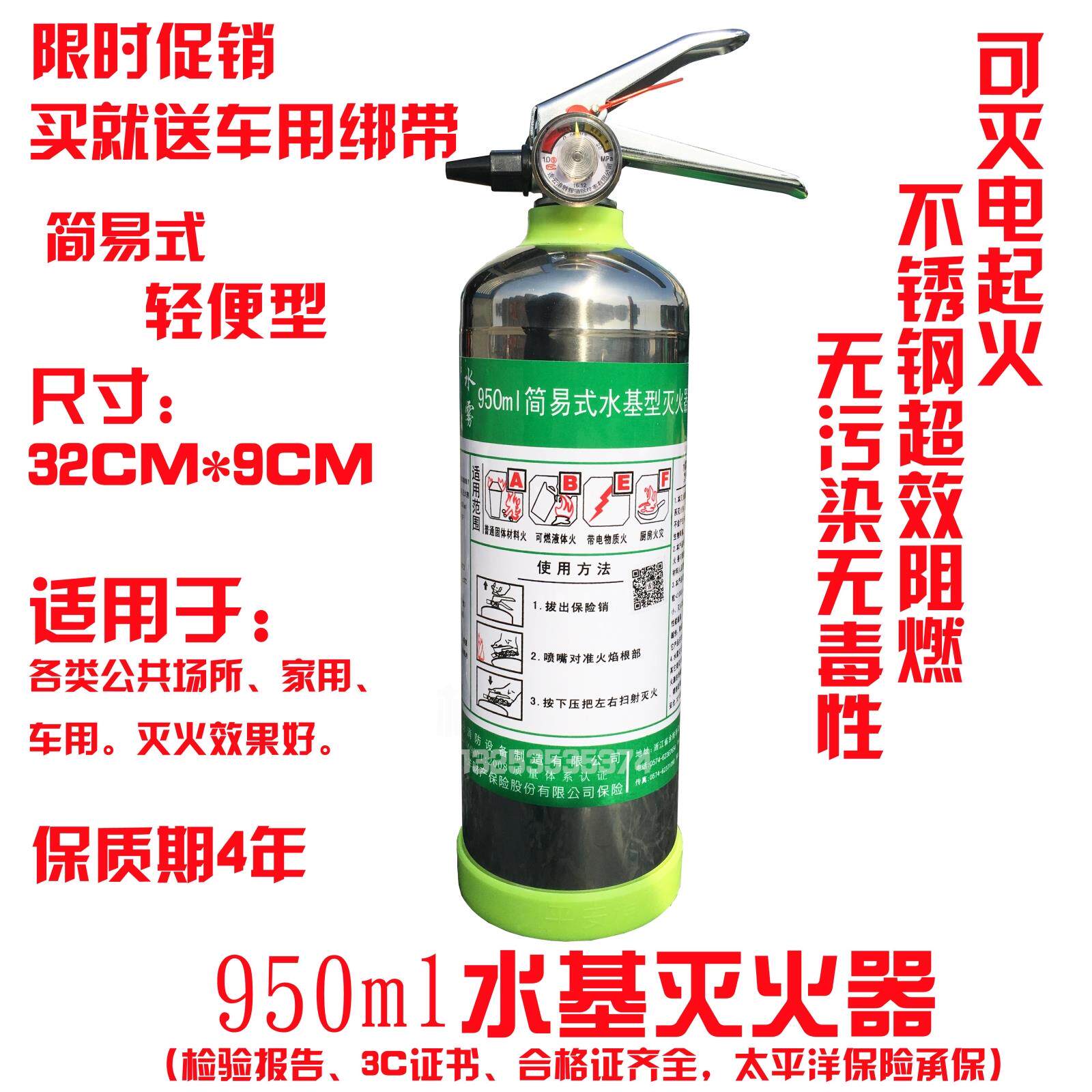 Огнетушитель Огнетушителя Водяного тумана -это новый тип огнетушителя.Автомобиль, домашняя кухня легковоспламеняющихся жидких пожарных и бытовых приборов,Эффект пожаротушения является значительным (1 более чем в два раза эффективен, чем обычные сухой порошок и огнетушители на основе воды).Расстояние распыления в два раза больше, чем средний огнетушитель (более безопаснее и эффективное огнетую).