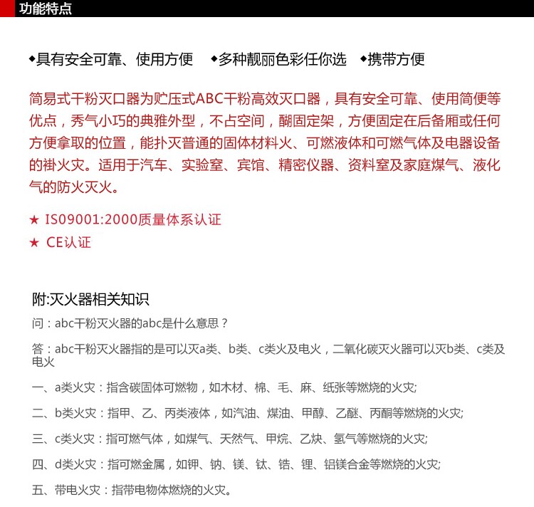 Простой пенопласт -огнетушитель, небольшая форма тела, легко переносить и не занимает эффективные места, обладает хорошей изоляцией, функцией огнетую для погашения: можно использовать для погашения: огонь класса А (обычный твердый материал), огонь класса B (легковоспламеняющийся Liquid Fire), класс C класс C, C, C, C, C Type C, класс C, класс C, C Type C, класс C, класс C, C Class C), класс C, C, C Class C, C Class C), Класс C класс C, тип C, класс C класс C) Огонь (газ и паровой огонь), пожар типа E (с огнем электрического материала) и т. Д.Подходит для переноса и использования различных моделей, удобных и безопасных.