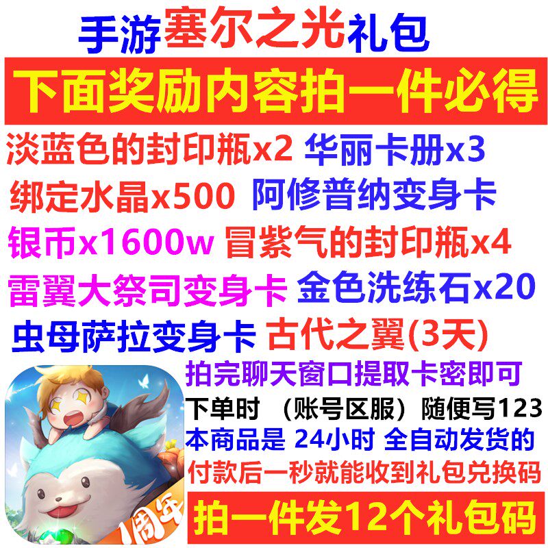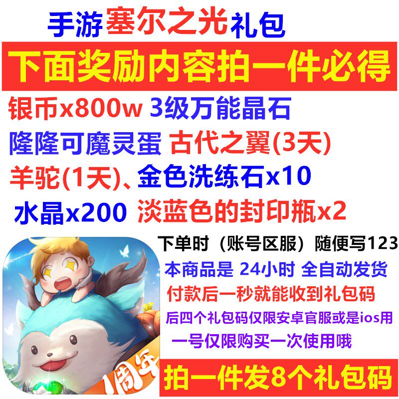 [手游赛塞尔之光礼包cdk金色洗灵石/银币400W/淡蓝色的封印瓶/]