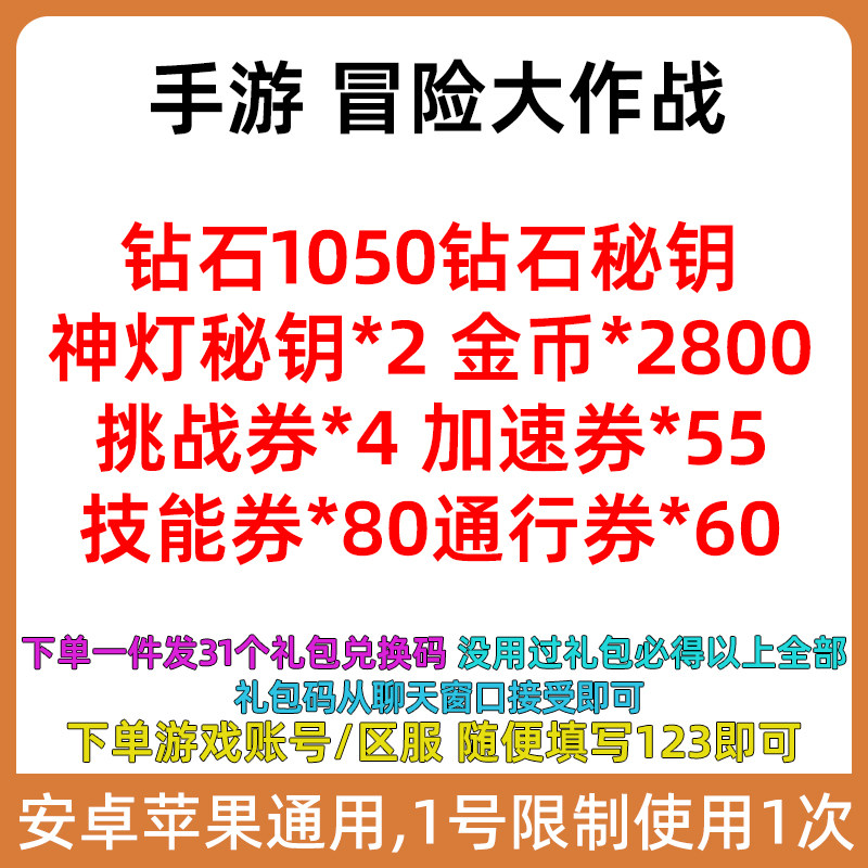 Mini Program Mobile Games Adventure Big Battle Gift Pack Полный набор из 31 кода выкупа Diamonds 1200 Gold Coins Key Challenge 劵