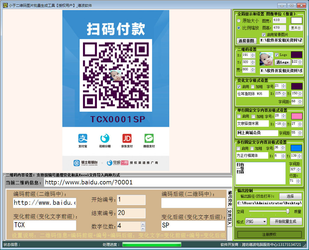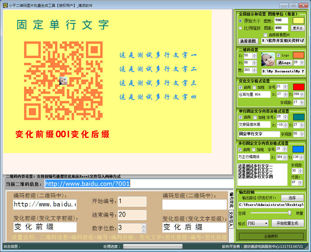 Размер и цвет фона создаваемого изображения можно свободно определить в правом верхнем углу интерфейса. Вся картинка состоит из 4 элементов: QR-код, меняющийся текст, фиксированный однострочный текст и фиксированный многострочный текст. Размер, положение и цвет этих четырех элементов можно установить по мере необходимости. Кроме того, к изображению QR-кода можно добавить изображение логотипа и установить размер изображения логотипа (обратите внимание, что если настройка логотипа слишком велика, это повлияет на распознавание сканирования кода). Можно установить шрифты и интервалы для трех типов текста. Весь процесс настройки просматривается в режиме реального времени в главном интерфейсе, который очень интуитивно понятен. После того, как вы будете удовлетворены предварительным просмотром, выберите путь вывода и сохраните формат изображения в правом нижнем углу и нажмите“Начать создание пакета”Кнопка для создания изображений в соответствии с заданными вами требованиями.