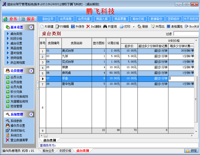 Гибкие сборы: например, разные цены для нескольких периодов времени каждый день, разные цены с понедельника по воскресенье, а также плата за открытие столов, плата за бронирование номеров, стартовые цены, праздничные цены и т. д. Поддерживается управление различными ценами для нескольких типов столов с мячом, таких как обычные столы с мячом и столы для снукера.Он поддерживает управление несколькими уровнями членских карточек и может настраивать обычные бронзовые членские карты, серебряное членство, золотое членство и т. д. Различные уровни членства могут пользоваться разными скидками (отдельные скидки на плату за продукт, плату за гольф, плату за игру и плату за аренду оборудования).Помимо использования скидок, вы также можете реализовать скидку на покупку 1000 и получение 100 бесплатно в зависимости от реальной ситуации.Настройка цен в системе очень понятна, и цена потребления для каждого типа стола может быть установлена для каждого участника.Например, цена обычных столов с мячом указана для нечленов, цена обычных столов с мячом указана для бронзовых участников, цена обычных столов с мячом указана для золотых участников и т. д.