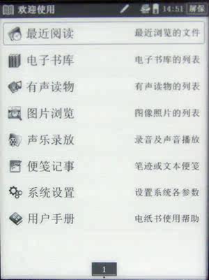 это хань -король N518E -бумага книгаСкорость довольно быстрая, от нажатия переключения до входа в основной каталог до 15 секунд.Основной каталог в основном включает в себя недавнее чтение, основную библиотеку, мультимедийное чтение, заметки, настройки системы и руководства пользователя.