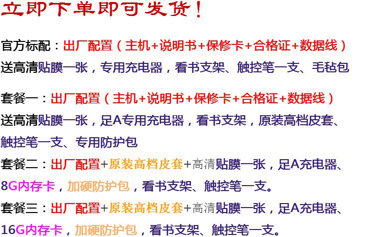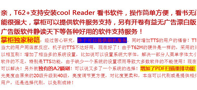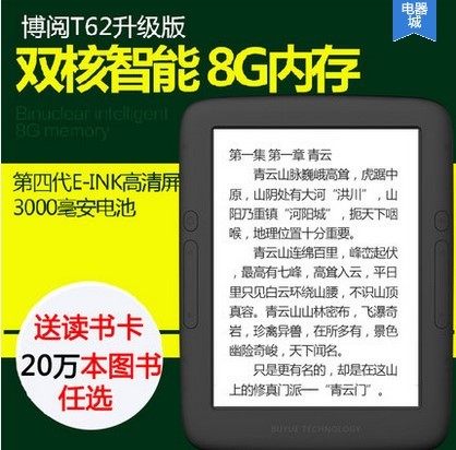 Последняя партия T62+была получена, и четвертый генерационный экран электронных чернил использовался для демонстрации эффекта. Машина использует новый процесс и чувствует себя лучше.Встроенный -в хранилище 8G, с подсветкой.Android 4.2 Система, двойная 1G Основная частота.