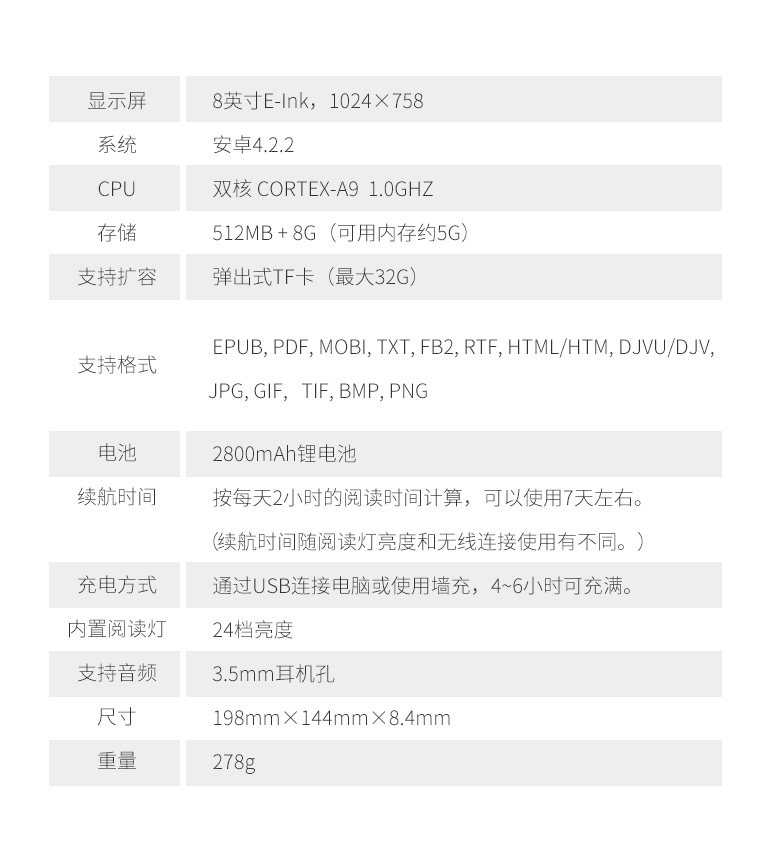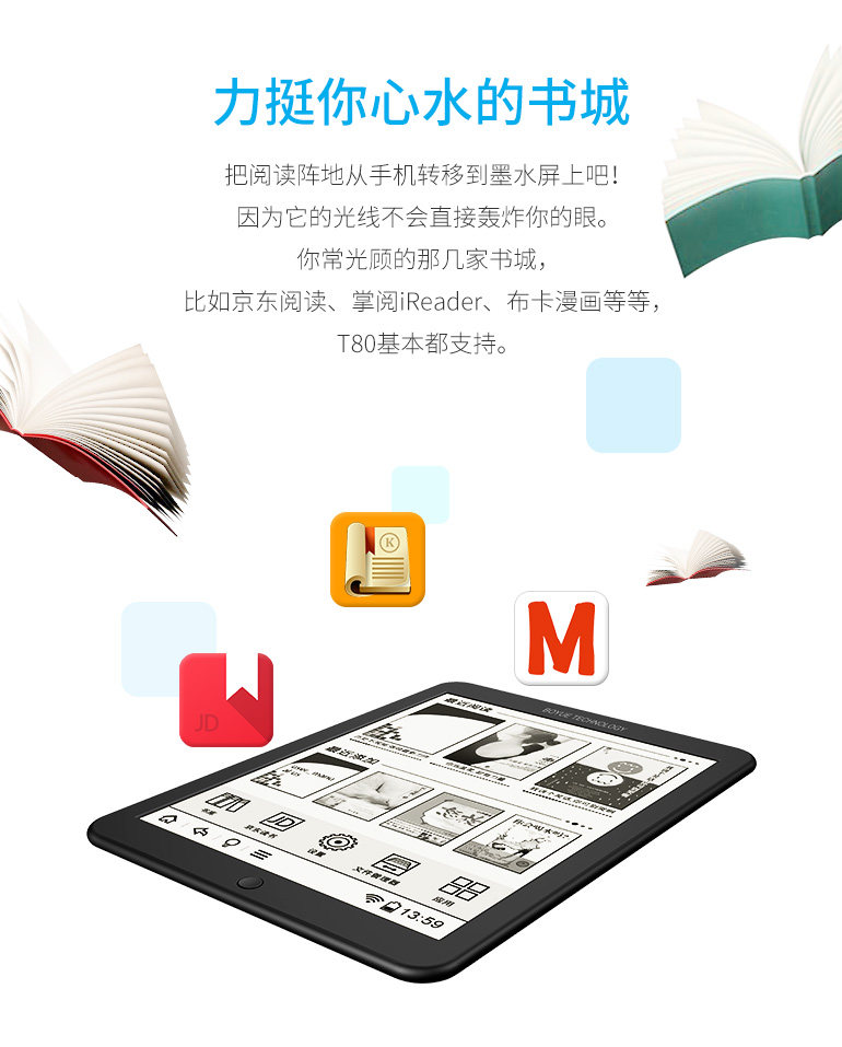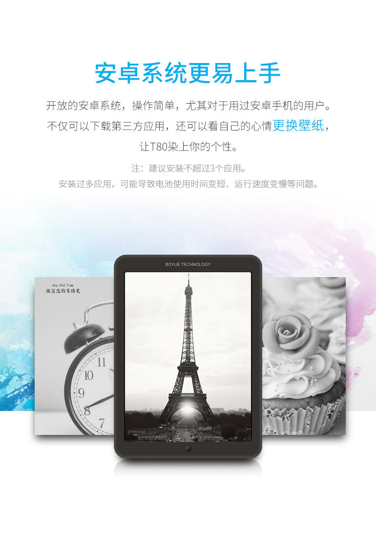 1.1. - Первая новая партия чтения блога T80 должна быть оговоркой. Используется новейший электронный экран чернил. Эффект дисплея более четкий. Машина принимает последний процесс и чувствует себя лучше.Память 8GХранение, система Android 4 работает быстрее и стабильнее!