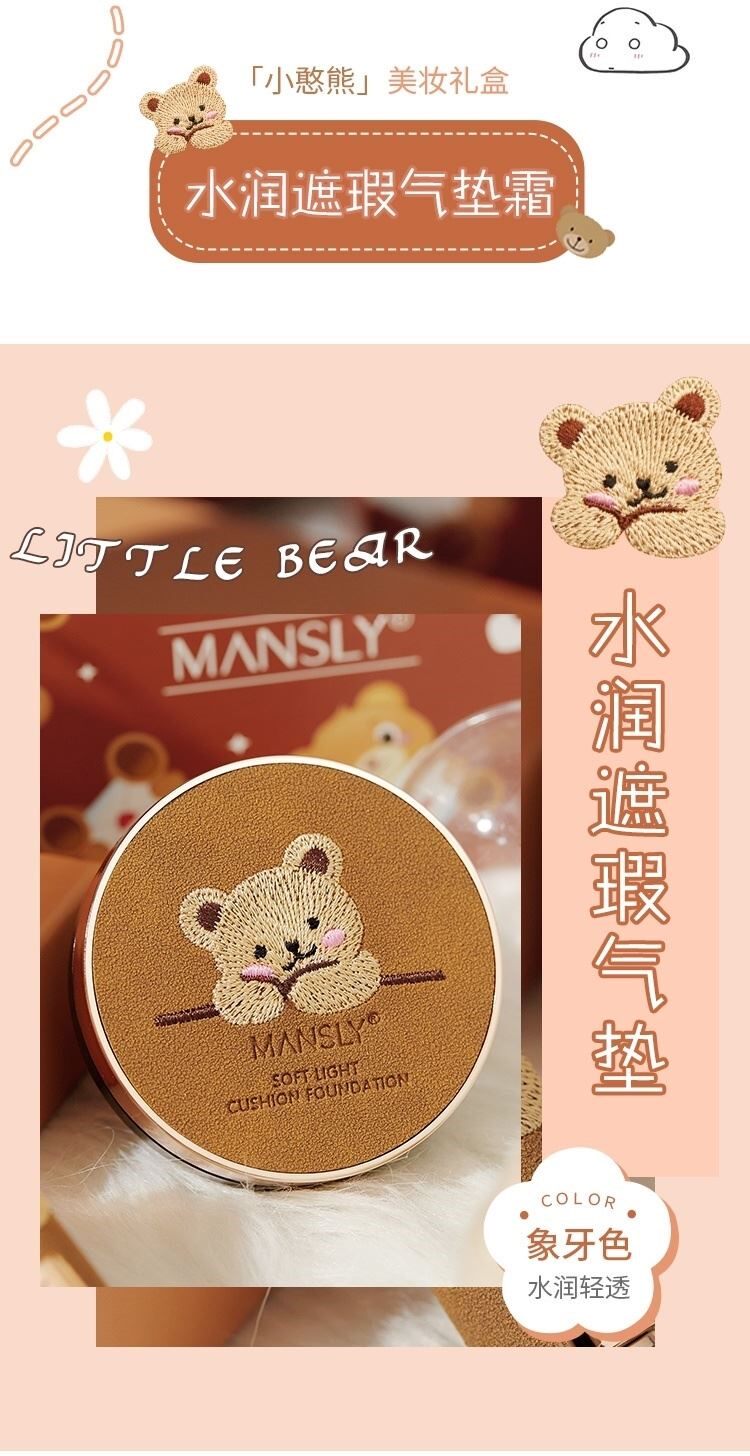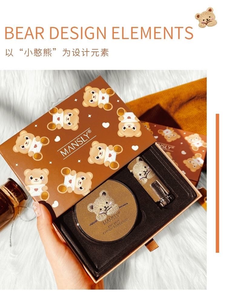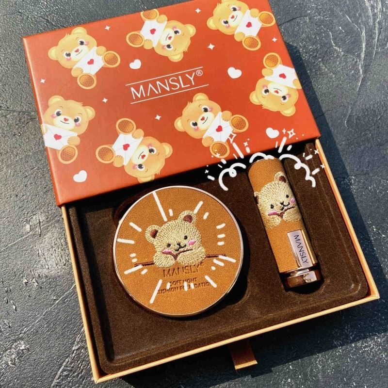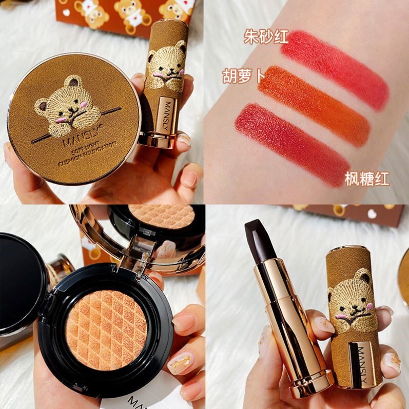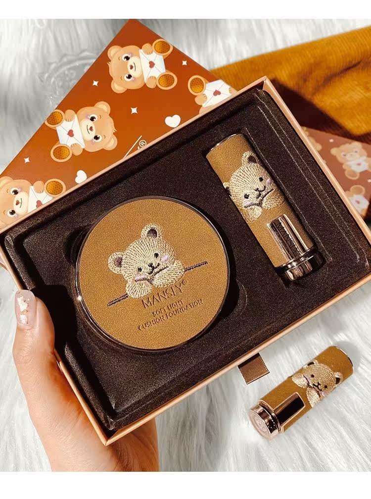Комплект, помада, подарочная коробка, кушон, тональный крем, консилер, 2 шт, с медвежатами, с вышивкой, долговременный эффект, подарок на день рождения