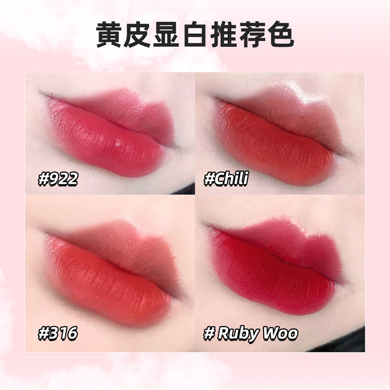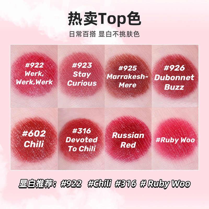 | Цвет: | Маленький перец#602 Chlil, Retro Zhenghong#70 Ruby Woo, Русский красный#612 русский красный, Hyuna#316 посвящена Chlil, Blues Strawberry Red#922 Werk Werk Werk, Peach oolong Color#923 оставайтесь любопытными, Марокканский красный коричневый#925 Марракеш просто, Роза Корова Кровь Браун#926 Дюбоннет Базз |