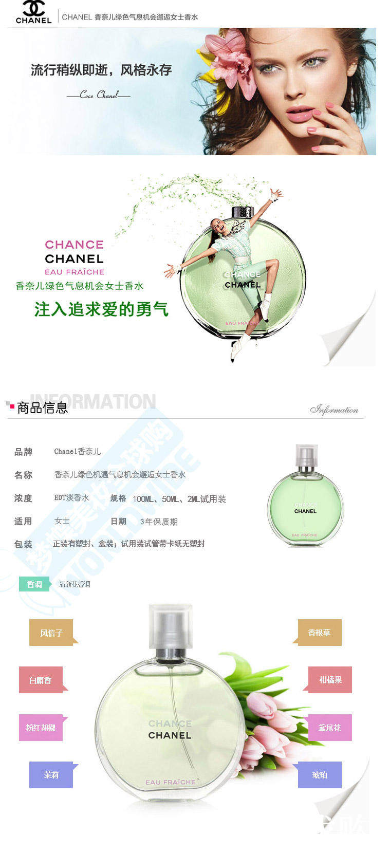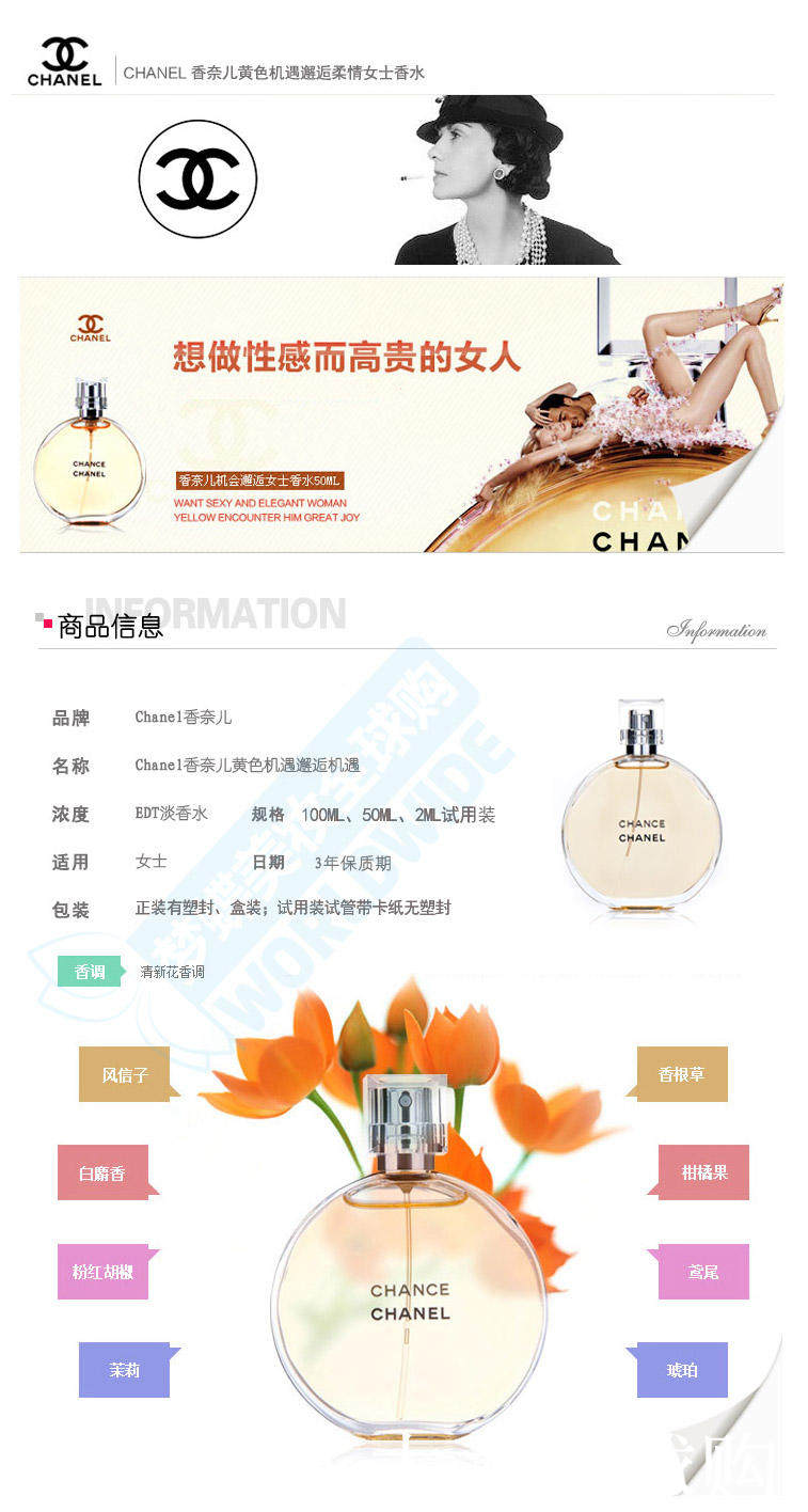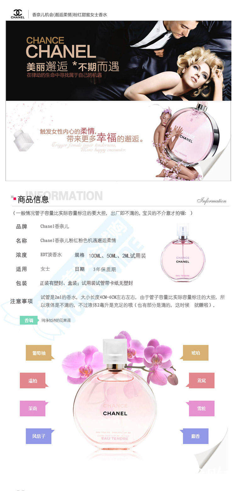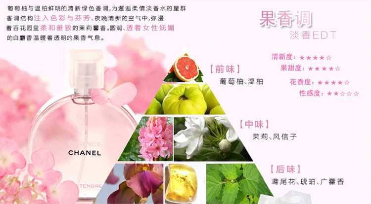 [店主有话说:][我觉得chance系列是chanel家里zui好闻的一个系列,无论是浓香还是淡香。有很多人不喜欢5号,不喜欢19,也不喜欢coco,却唯独爱上这款chance。这并不是巧合,只是因为它真的很惹人喜欢。][橙色活力邂逅]