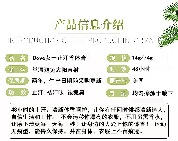 DOVEАнти -неразовый аромат может дать вам48Защита часов уменьшит секрецию вашего подмышечного пота, что дает вам освежающее и удобное ощущение.Новое поколение улучшенной формулы эффективно подавляет бактерии поверхности тела, особенно подходящую для использования волос подмышки.