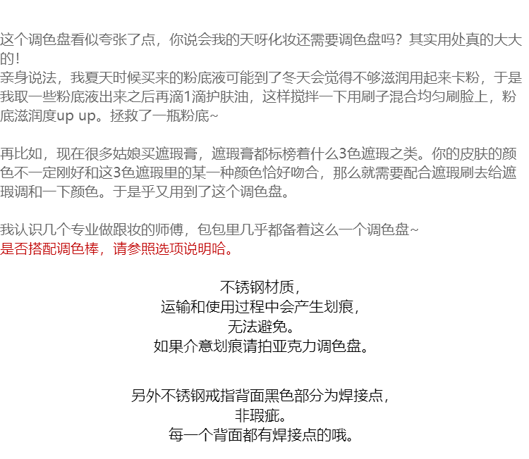| Цвет: | Плоский диск из нержавеющей стали посылает толстый тон, Yayli flat disk bar, Love Alley Palm Plate (нет отличного), Пальмальная пластина полукругального акрила (без палки), Маленькое кольцо, палитра для тонирования, Кольцо, палитра, увеличенная толщина |