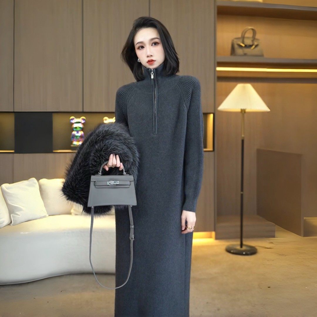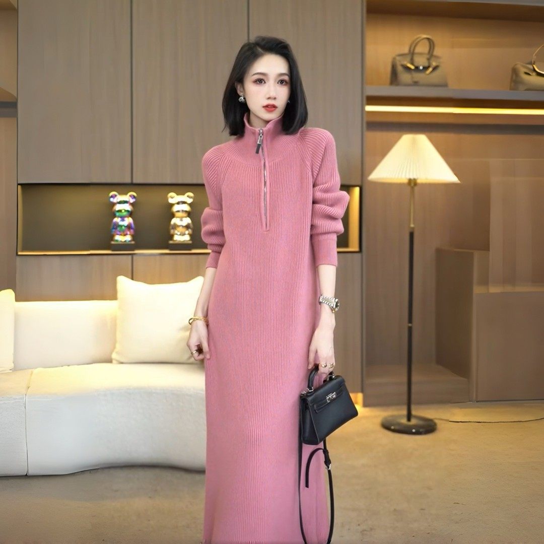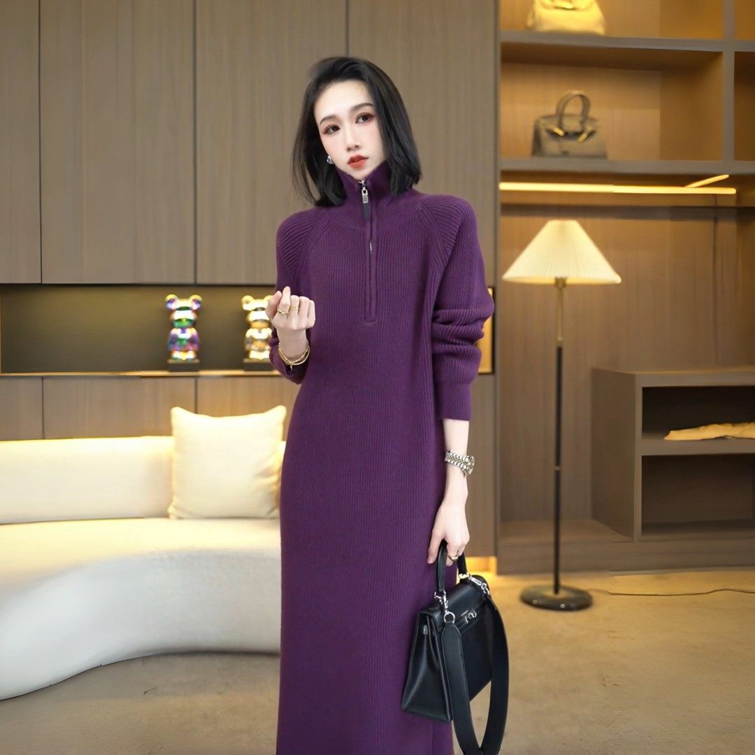 Длинное трикотажное платье с молнией, изысканный стиль, средней длины