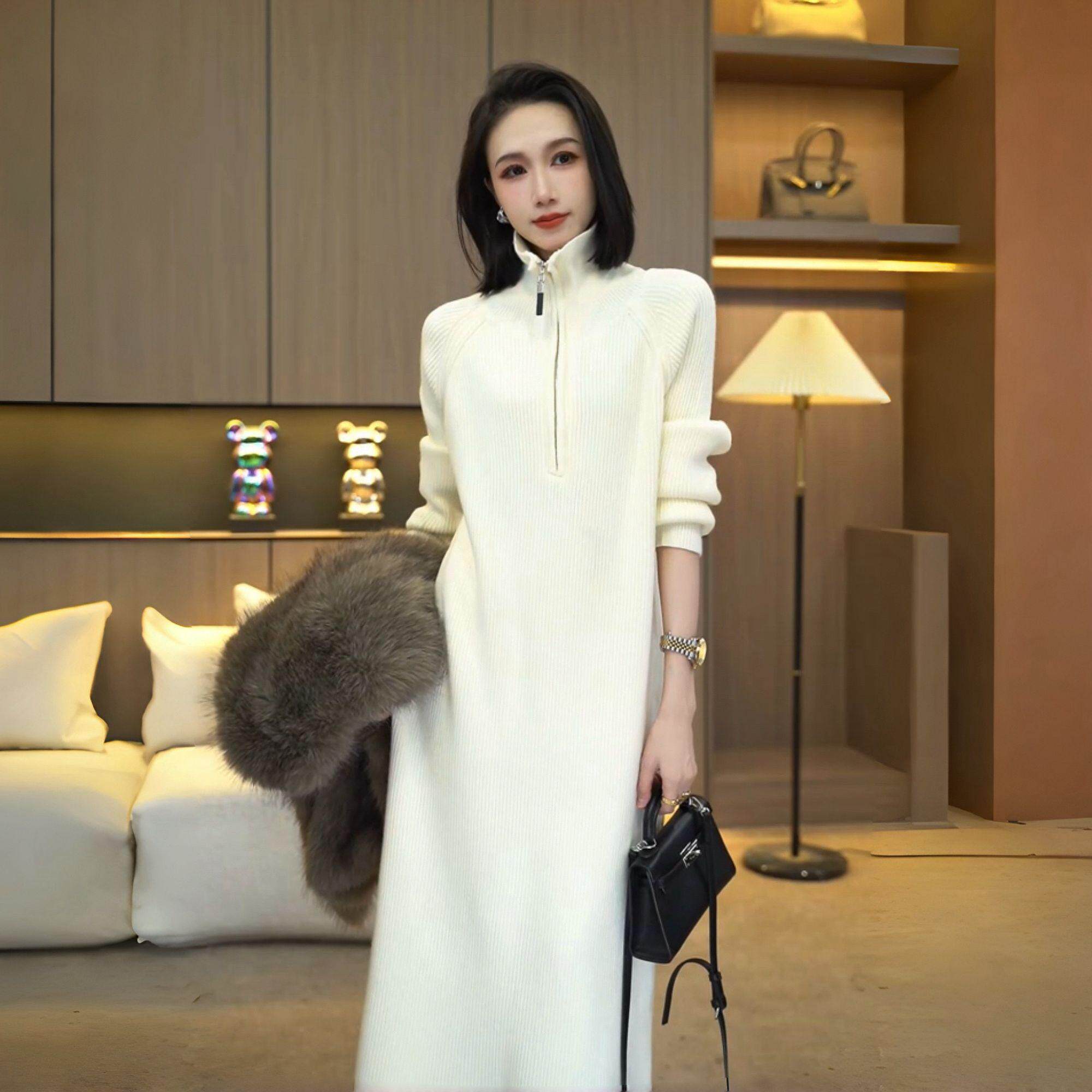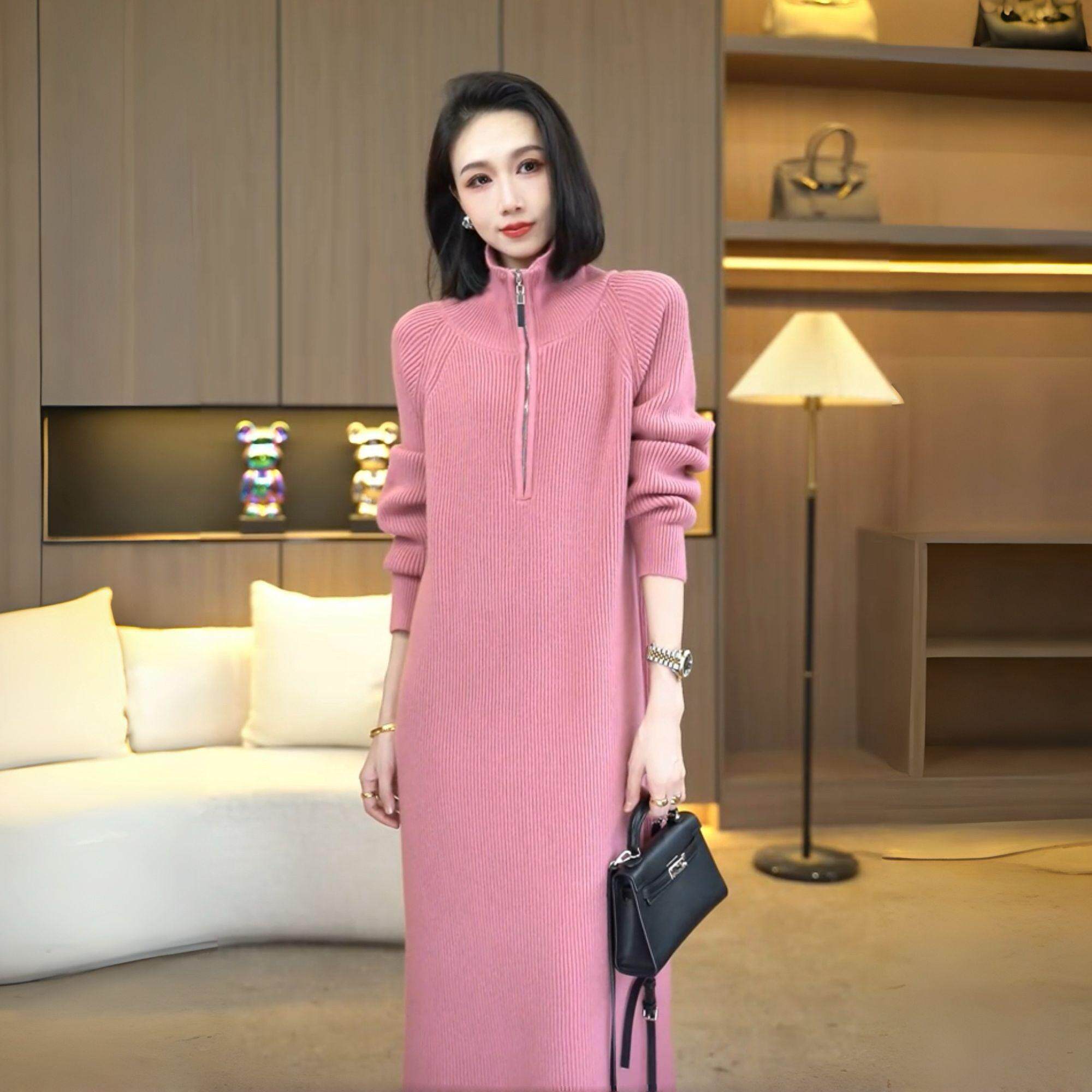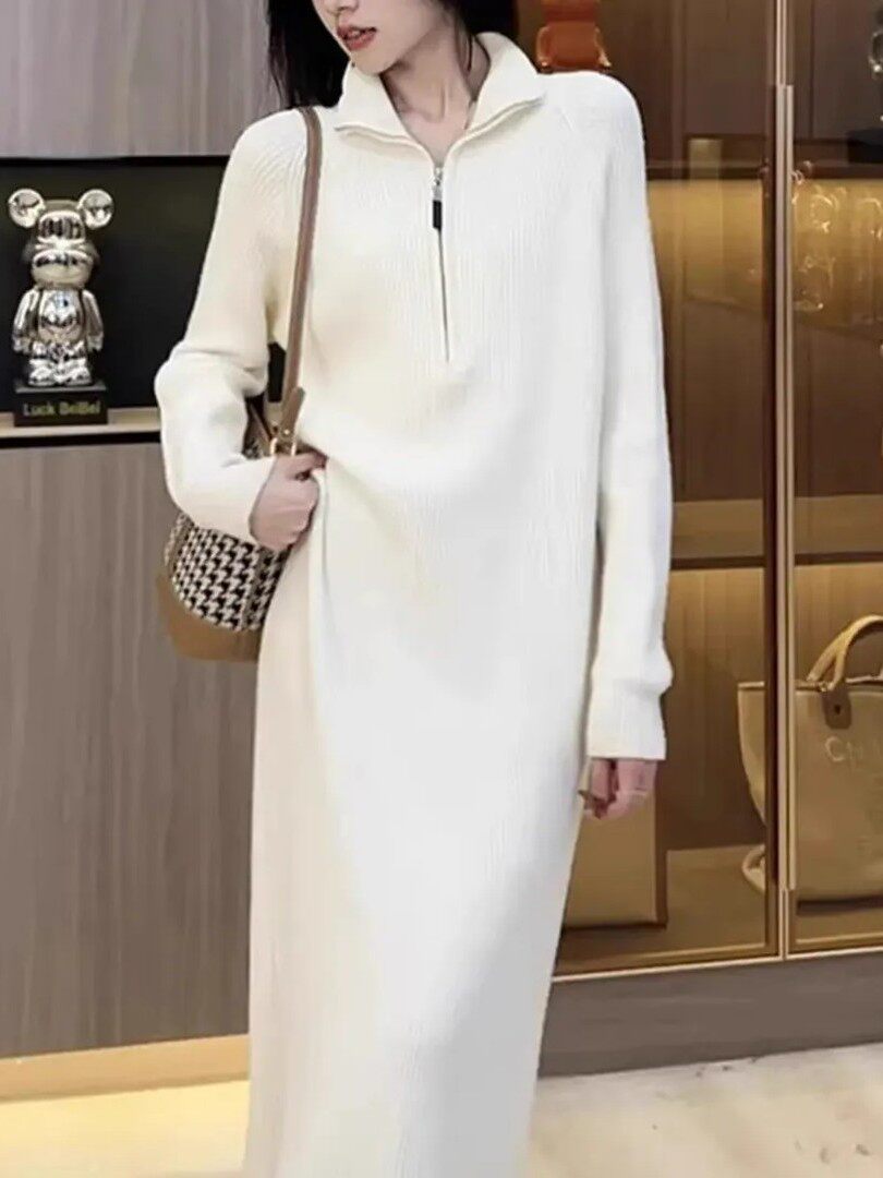 Длинное трикотажное платье с молнией, изысканный стиль, средней длины