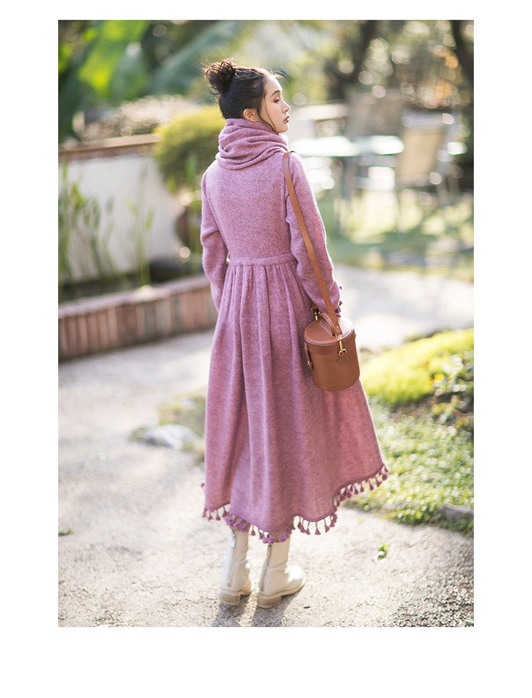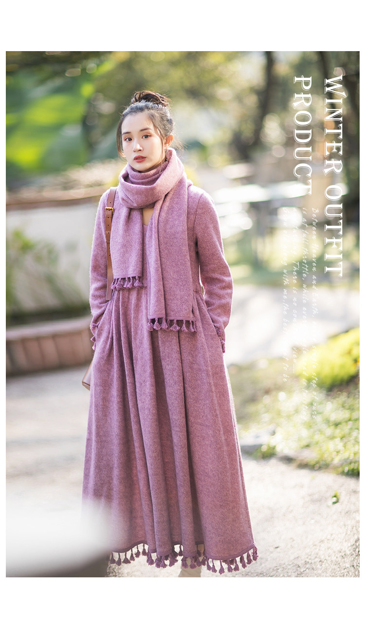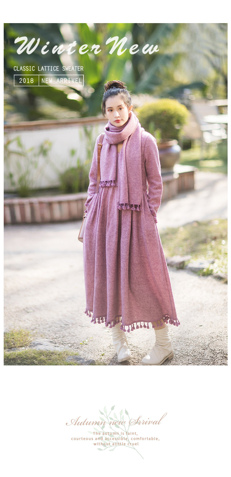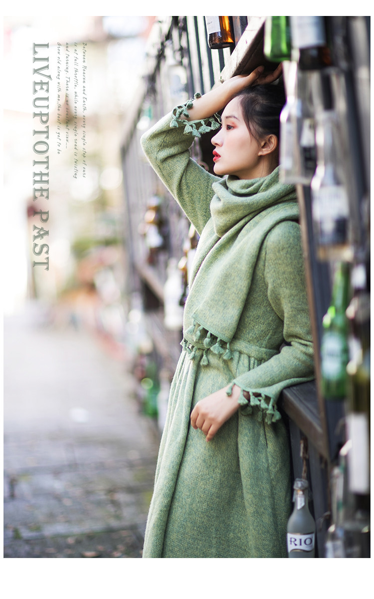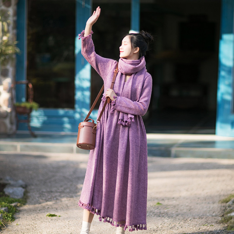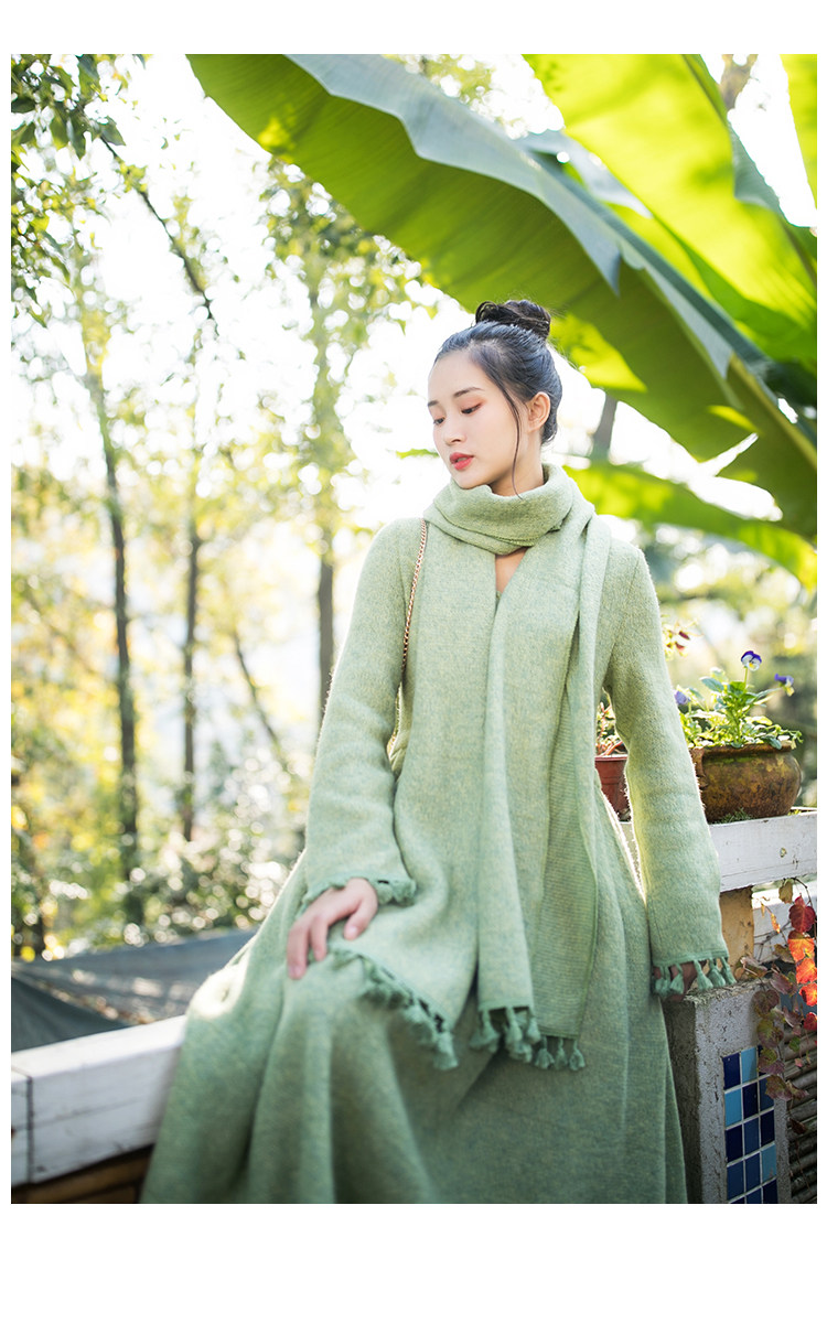 Осенний длинный шерстяной трикотажный лонгслив, платье с кисточками, шарф, (в наличии на складе), из хлопка и льна, коллекция 2021, средней длины
