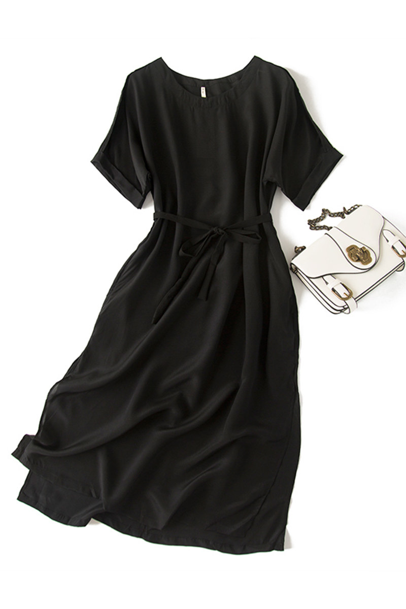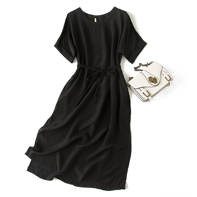 Шелковый материал, черный ремень, длинное платье, средней длины
